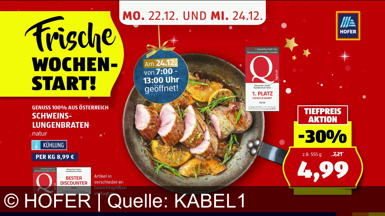 Ein Hofer-Werbeplakat mit rotem Hintergrund, gelber Schrift: "Frische Wochenstart!" Ein Bild einer Pfanne mit Schweinslungenbraten und Beilagen. Aktionen: -30% Rabatt, Preis 4,99 € statt 7,21 €. Öffnungszeiten am 24.12. von 7:00 bis 13:00 Uhr. Text: "Genuss 100% aus Österreich", "Kühlung". Qualitätauszeichnung und Hinweis auf Artikelauswahl.