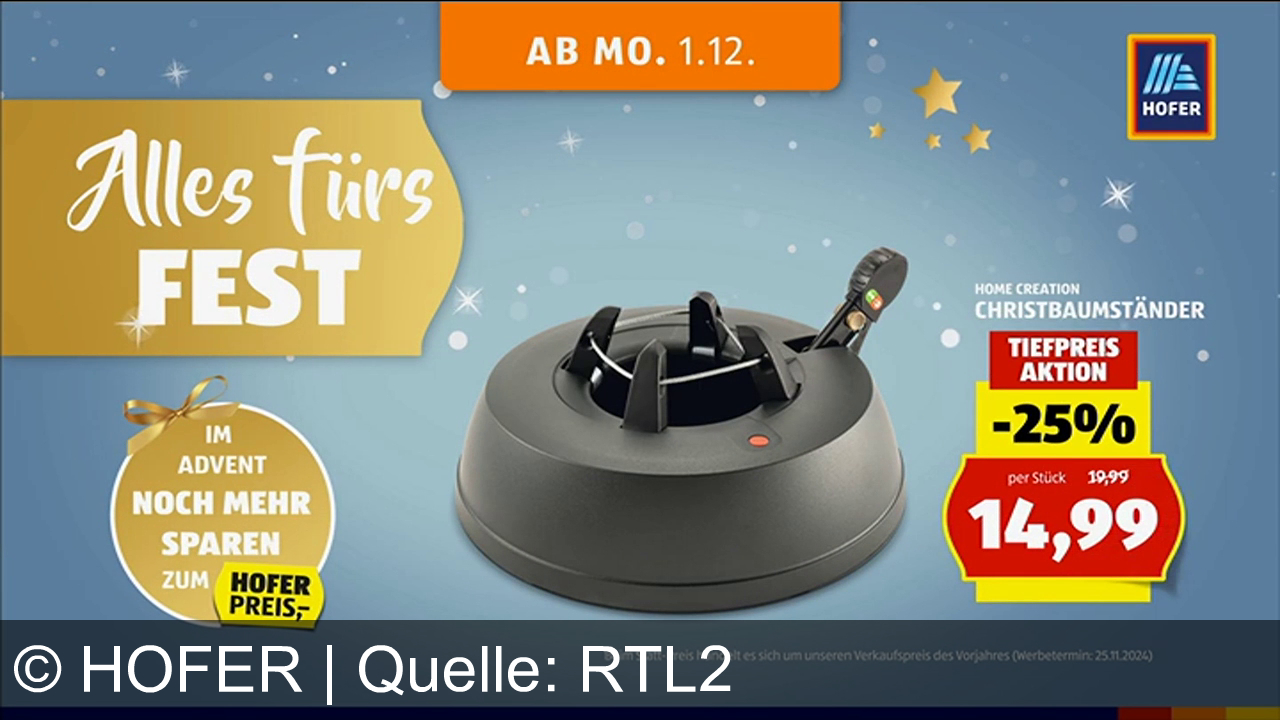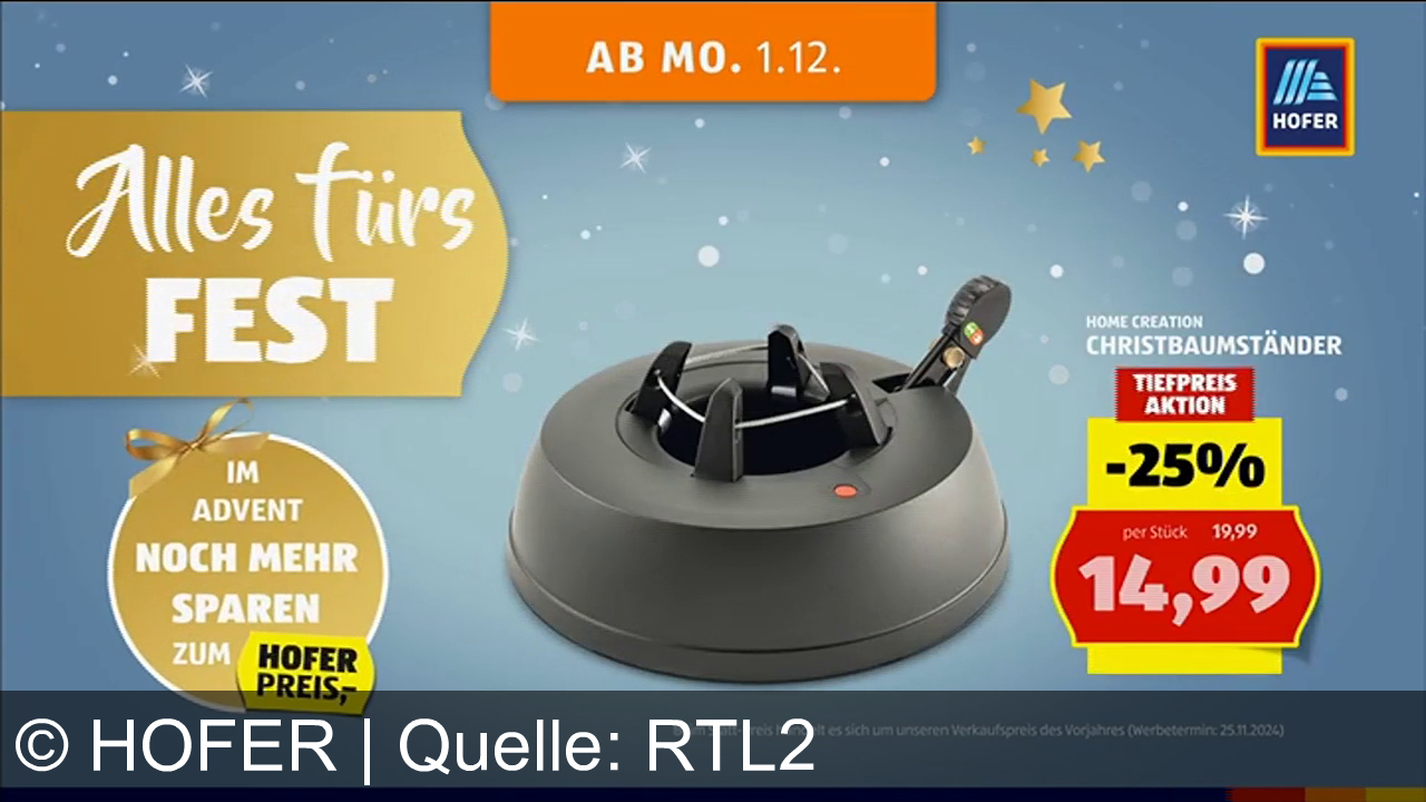 Hofer bietet ab 1. Dezember Christbaumständer für 14,99 € (statt 19,99 €) und Kinderbücher für 2,99 € (statt 4,99 €) an. Im Advent profitieren Kund:innen von attraktiven Tiefpreisen beim „Besten Discounter“. Werbeaussage: Mehr sparen zum Hofer-Preis.
