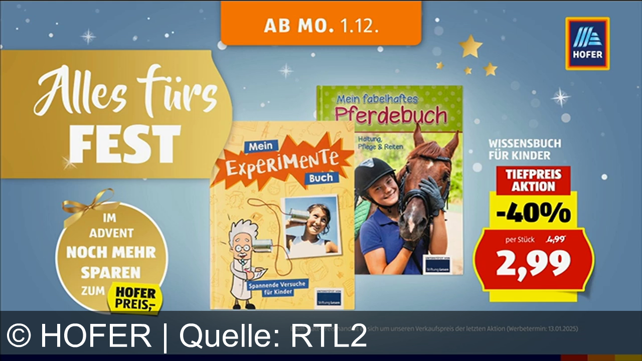 Alles fürs Fest, ab 1.12. verfügbar. Zwei Bücher für Kinder: "Mein Experimente Buch" und "Mein fabelhaftes Pferdebuch". Tiefpreisaktion -40%, jetzt 2,99 statt 4,99. Im Advent noch mehr sparen zum Hofer Preis. Sterne und ein blauer Hintergrund zieren die Anzeige. Hofer-Logo oben rechts.