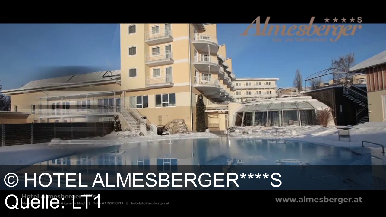 Ein gelbes Hotel mit mehreren Etagen, Balkonen und Fenstern. Draußen ein großer, rechteckiger Pool, teilweise zugefroren. Die Umgebung ist mit Schnee bedeckt. Links moderne Gebäude mit Glasfassade, rechts Holzgebäude. Oben rechts steht "Almesberger". Unten Kontaktinformationen von Hotel Almesberger in Algen-Schlägl.