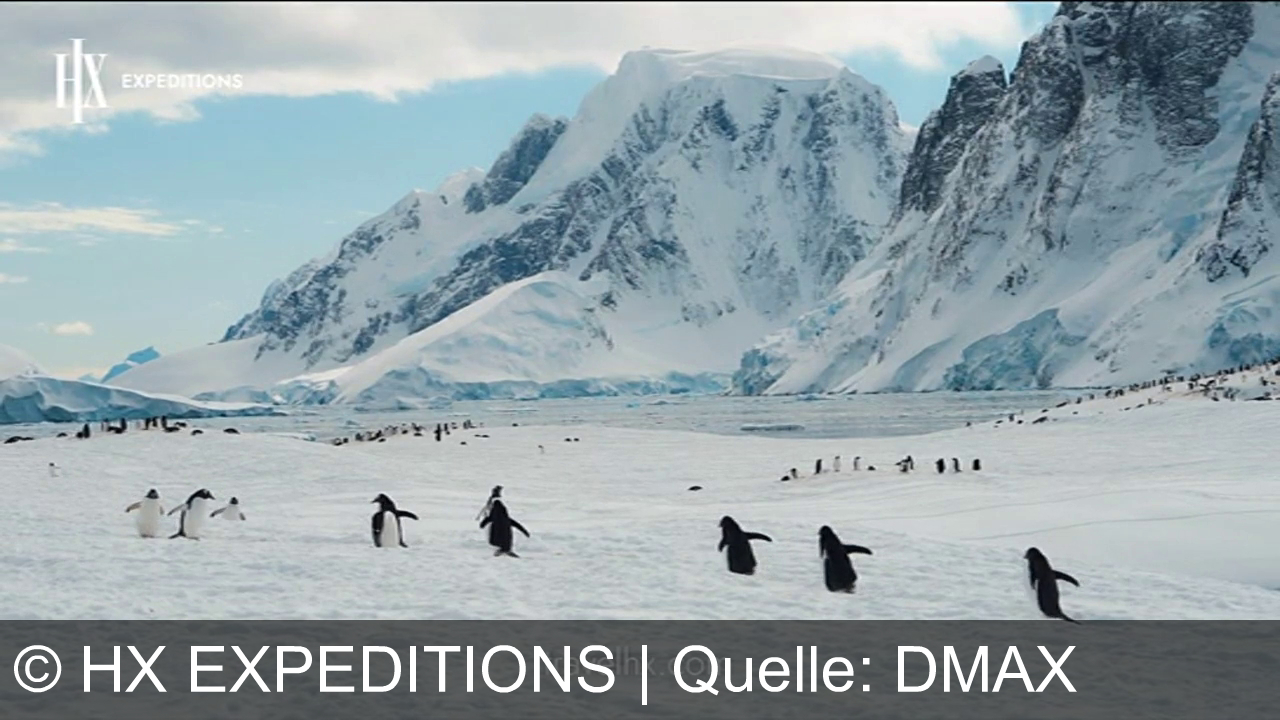 Eine Gruppe Pinguine läuft über eine schneebedeckte Landschaft. Im Hintergrund erheben sich hohe, eisbedeckte Berge. Der Himmel ist teilweise bewölkt. Links oben steht "HX Expeditions" und unten die URL "travelhx.com".