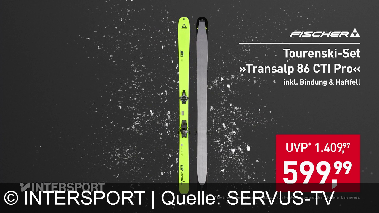 Schwarzer Hintergrund mit Schneespritzern. Links ein neongelber Ski vertikal nebeneinander mit Haftfläche. Rechts der Text "Fischer Tourenski-Set 'Transalp 86 CTI Pro‘ inkl. Bindung & Haftfell". Unten Intersport-Logo. Großes rotes Preisschild mit UVP 1.409,97€ durchgestrichen, nun 599,99€. Hinweis zur Unverbindlichen Preisempfehlung.