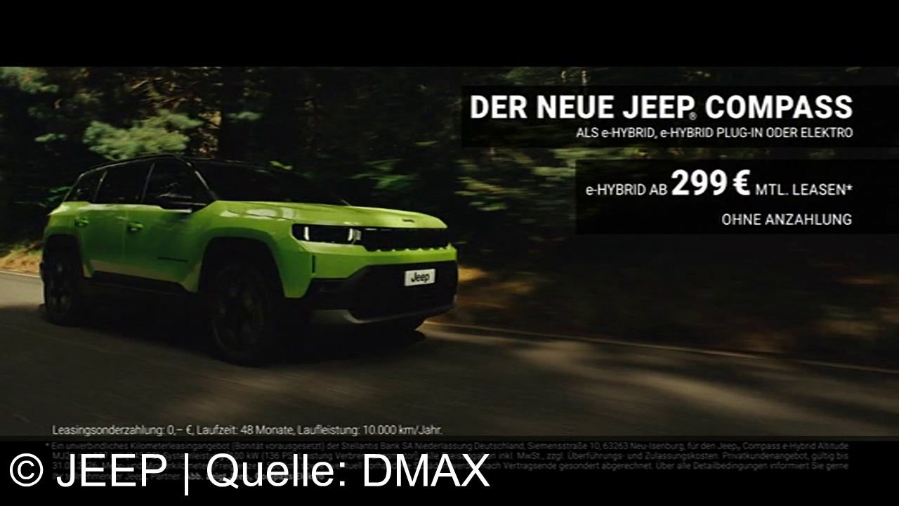 Der Spot zeigt den Jeep Compass als komfortablen Offroad‑SUV für echte Abenteuer. Vorgestellt wird ein Leasingangebot ab 299 Euro im Monat ohne Anzahlung. Die Werbung betont Robustheit, Freiheit und vielseitige Einsatzmöglichkeiten des Fahrzeugs.