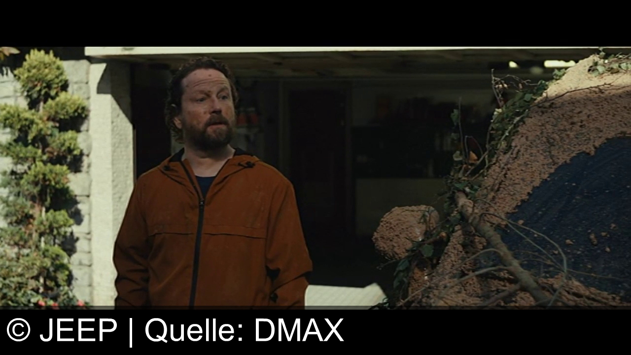 Ein Mann steht vor einer Garage und schaut nach rechts. Er trägt eine orange Jacke und hat Schmutz im Gesicht. Neben ihm liegt ein Auto, das komplett mit Erde, Ästen und Efeu verdreckt ist.