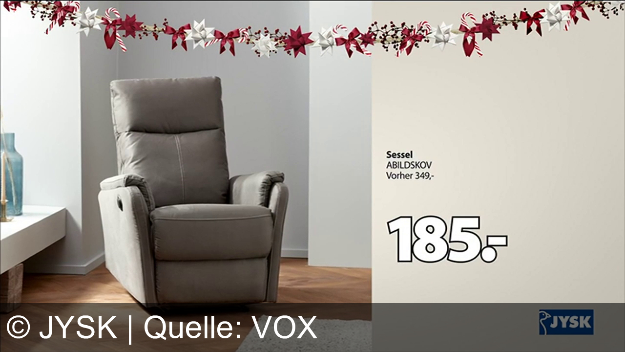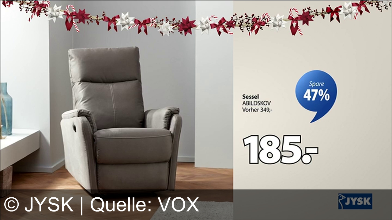 Werbung aus dem Jahr 2025 von Jysk in Österreich, mit dem von uns gewählten Titel: "JYSK: Stylischer Sessel ABILDSKOV 47 % günstiger und Weihnachtsdeko bis zu 60 % reduziert" mit der Kurzbeschreibung: "Feiere Weihnachten mit JYSK: Stylischer Sessel, Plattenspieler, Sofa & Deko – spare bis zu 60 % auf Weihnachtsartikel! JYSK – Scandinavian Sleeping & Living.". Diese Werbung thematisiert oder beinhaltet die Kategorien Geschenk, Dekoration, Regal, Kissen.