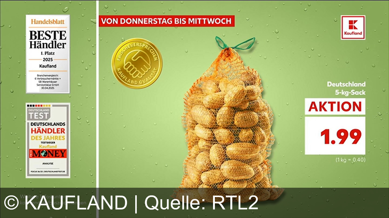 Ein Netz voller Kartoffeln. Links Auszeichnungen von Handelsblatt und Deutschland Test. Rechts Preisangabe: 5-kg-Sack für 1,99 Euro. Darüber steht "Von Donnerstag bis Mittwoch". Oben und unten das Kaufland-Logo. Das Frischeversprechen-Siegel befindet sich links. Hintergrund in hellem Grün mit Wassertropfen.