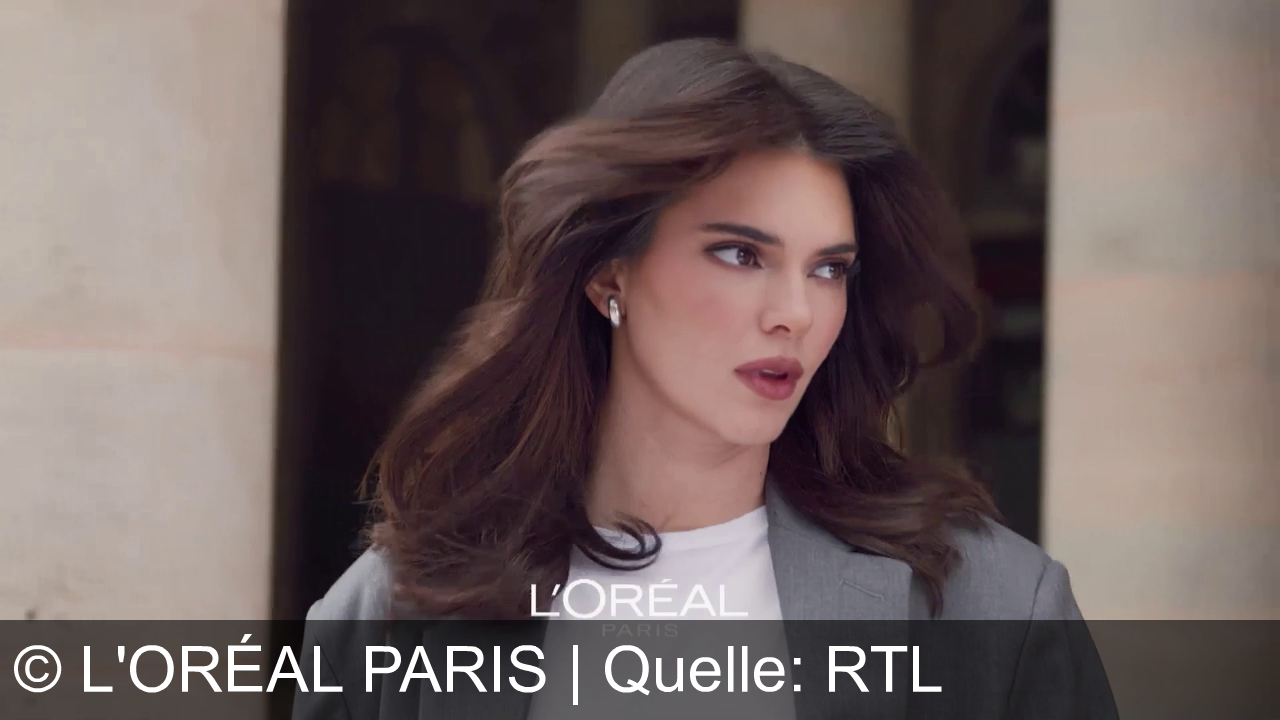 Eine Frau läuft draußen entlang, ihr Haar weht im Wind. Sie trägt Ohrringe, einen grauen Blazer und ein weißes Shirt. Vor ihr steht groß das Wort L’Oréal Paris eingeblendet.