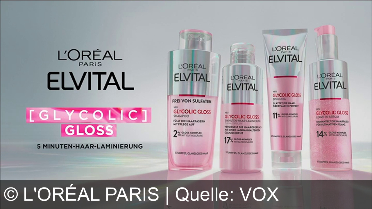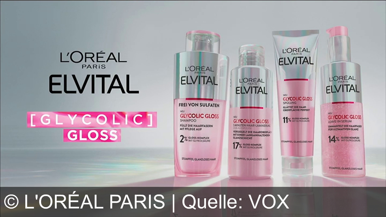 Werbung aus dem Jahr 2025 von L'oréal Paris in Österreich, mit dem von uns gewählten Titel: "L'Oréal Paris Elvital Glycolic Gloss: In 5 Minuten zu glänzendem, gepflegtem Haar mit Glykolsäure" mit der Kurzbeschreibung: "Elvital Glycolic Gloss von L'Oréal Paris – erlebe in nur 5 Minuten das glanzvollste Haar deines Lebens mit strahlendem Ergebnis bis zu 10 Haarwäschen!". Diese Werbung thematisiert oder beinhaltet die Kategorien Shampoo, Haarfarbe, Pflege, Kosmetik, Make-Up.