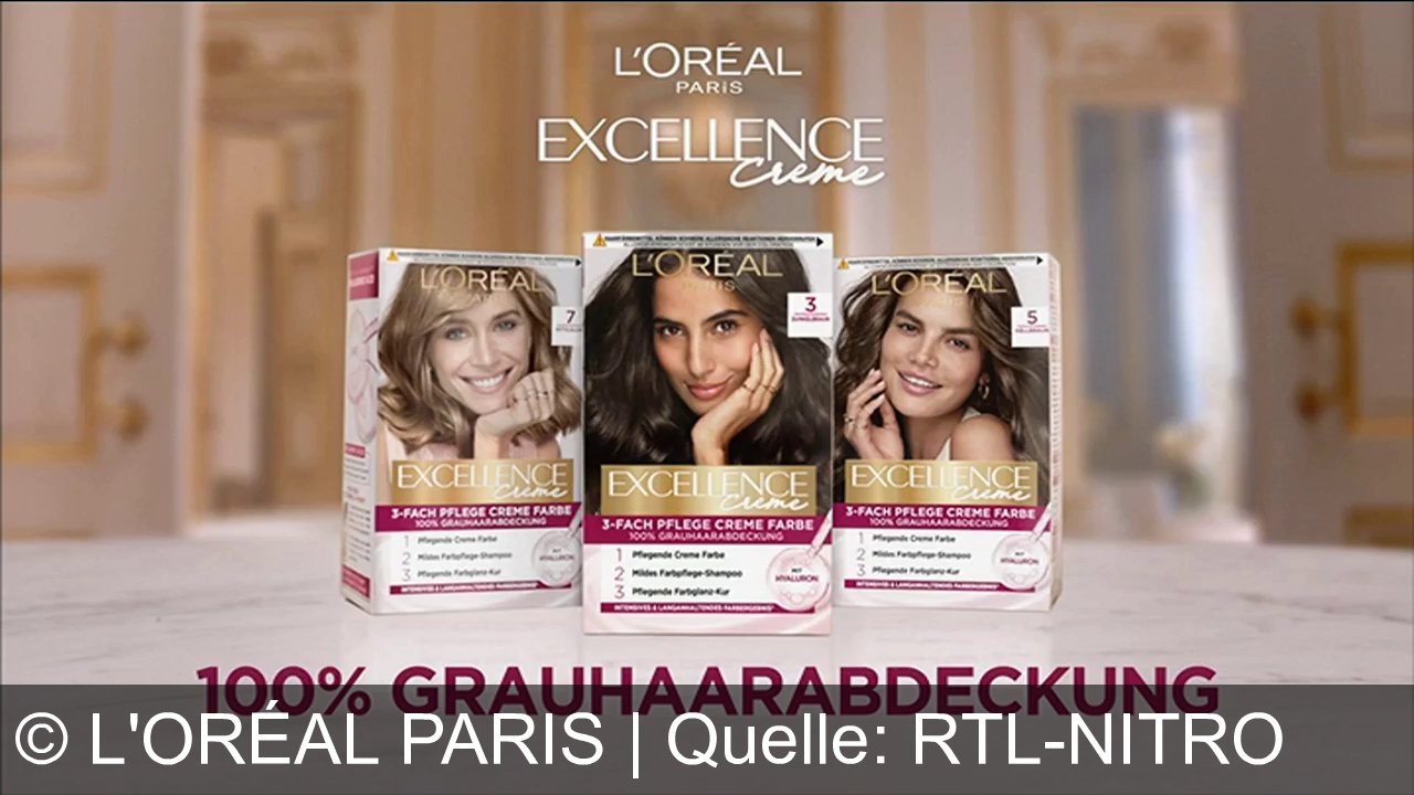 Werbung aus dem Jahr 2025 von L'oréal Paris in Österreich, mit dem von uns gewählten Titel: "Excellence-Creme: Lebendige Farben & Pflege mit Hyaluron von L'Oréal Paris!" mit der Kurzbeschreibung: "Verwandle Grau in Wow mit der Excellence Creme von L'Oréal Paris – 100% Grauhaarabdeckung, Dreifach-Pflege mit Hyaluron und Magic Retouch Ansatzkaschierer. Weil du es dir wert bist!". Diese Werbung thematisiert oder beinhaltet die Kategorien Haarfarbe.