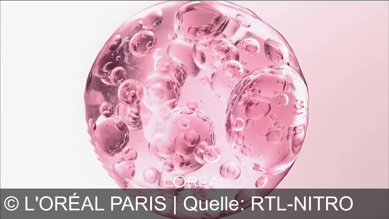 Eine runde rosafarbene Flüssigkeit mit Blasen. "L'Oréal Paris" steht unten im Bild. Der Hintergrund ist ebenfalls rosafarben.
