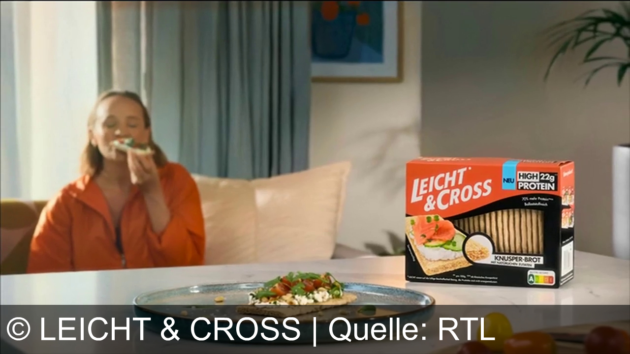 Der TV-Spot von Leicht und Cross zeigt humorvoll kleine Alltagshürden, denen die Protagonistin mit Gelassenheit begegnet. Im Fokus steht das Knusperbrot, das nun mit einer Extraportion Protein beworben wird. Die zentrale Werbeaussage lautet, Situationen leicht zu nehmen und sich mit dem krossen, belegten Snack einen genussvollen Moment zu gönnen.
