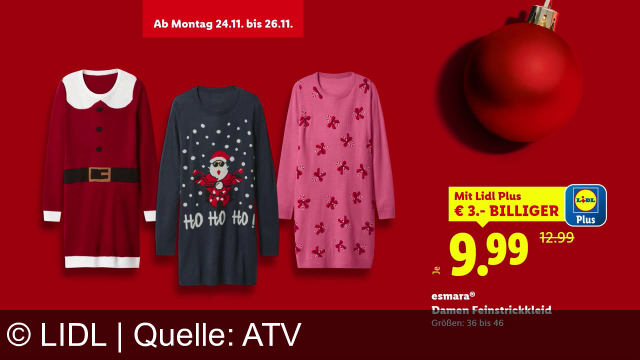 Lidl bewirbt festliche Damenfeinstrickkleider (ab 9,99 €) und Damenleggings (ab 7,99 €), mit zusätzlichem Rabatt für Lidl Plus-Nutzer. Die Werbebotschaft: Stylische Weihnachtsmode zum Vorteilspreis – mit Lidl Plus doppelt sparen. Lidl lohnt sich, besonders im November.
