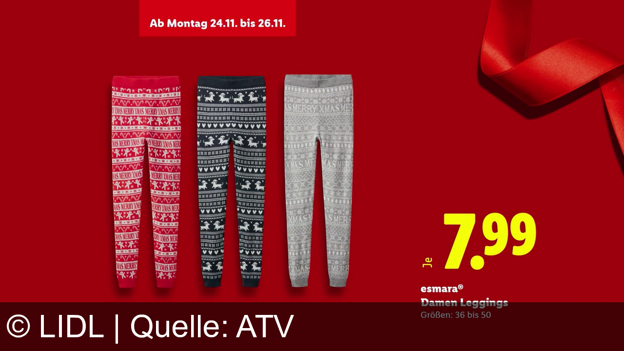 Drei Damen-Leggings in verschiedenen Mustern auf rotem Hintergrund. Oben links rot-weiße Leggings mit "Merry Xmas", daneben dunkelgraue mit Rentier- und Herzmotiven, rechts hellgraue mit ähnlichem Muster. Text: "Ab Montag 24.11. bis 26.11.". Preis: 7,99 Euro, Marke: Esmara, Größen: 36 bis 50. Rechts eine rote Schleife.