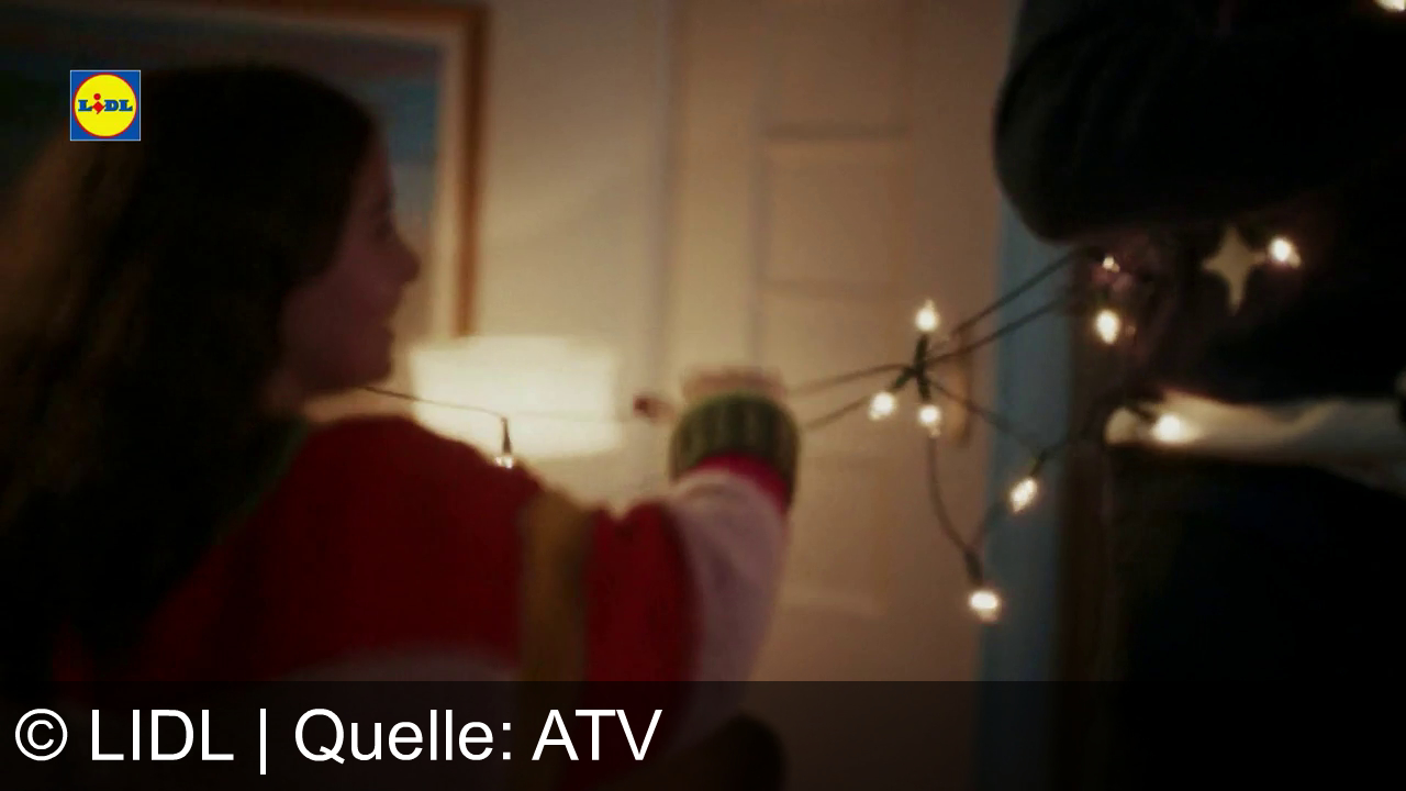 Ein Mädchen im roten Pullover hält eine Lichterkette. Eine Person neben ihr trägt ebenfalls Lichter. Im Hintergrund ein Bild an der Wand und eine Lampe auf einem Tisch. Oben links ist ein Lidl-Logo sichtbar.