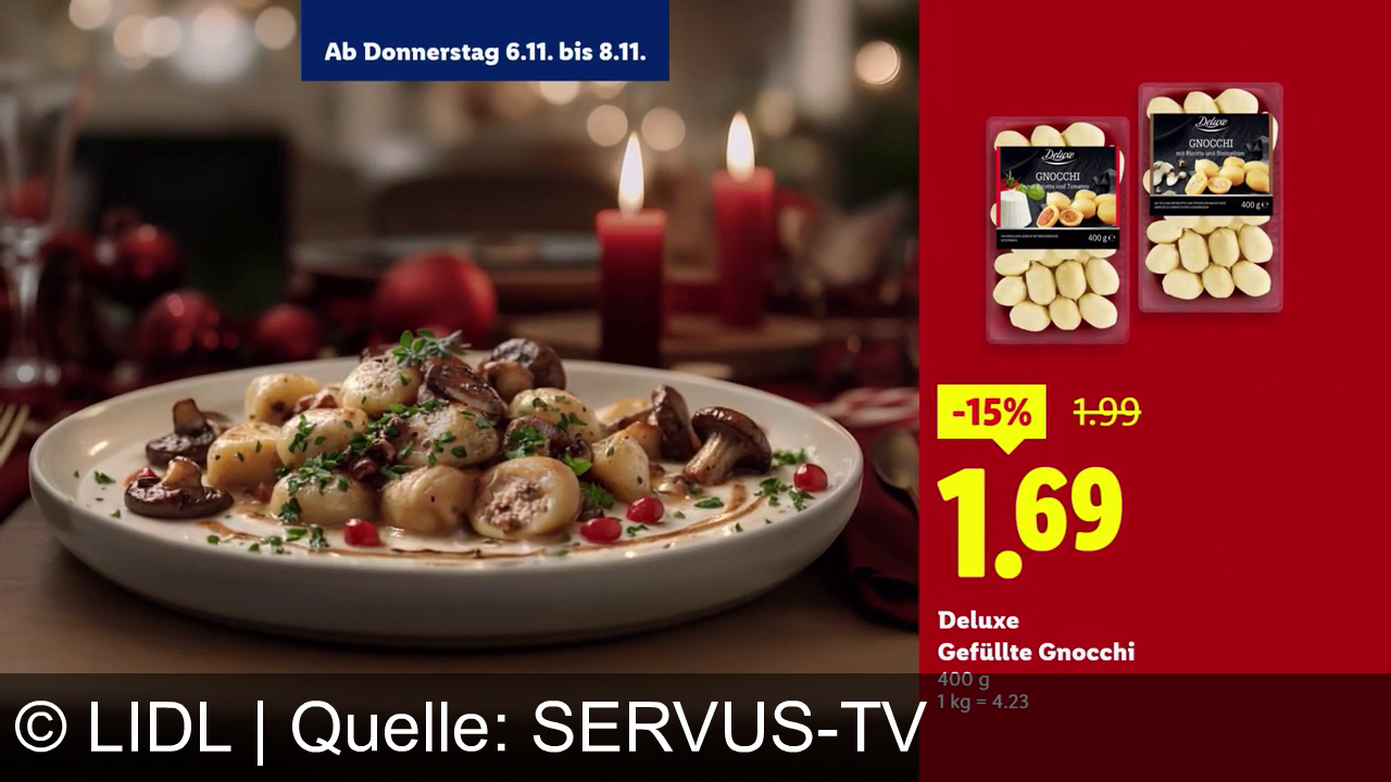 Lidl bewirbt festliche "Deluxe"-Spezialitäten wie gefüllte Gnocchi ab 1,69 € und über 350 weitere Produkte für besondere Genussmomente zu Weihnachten. Mit Lidl Plus profitieren Kunden zusätzlich von doppelten Rabatten. Werbeaussage: Lidl lohnt sich für genussvolle und preiswerte Feiertage.