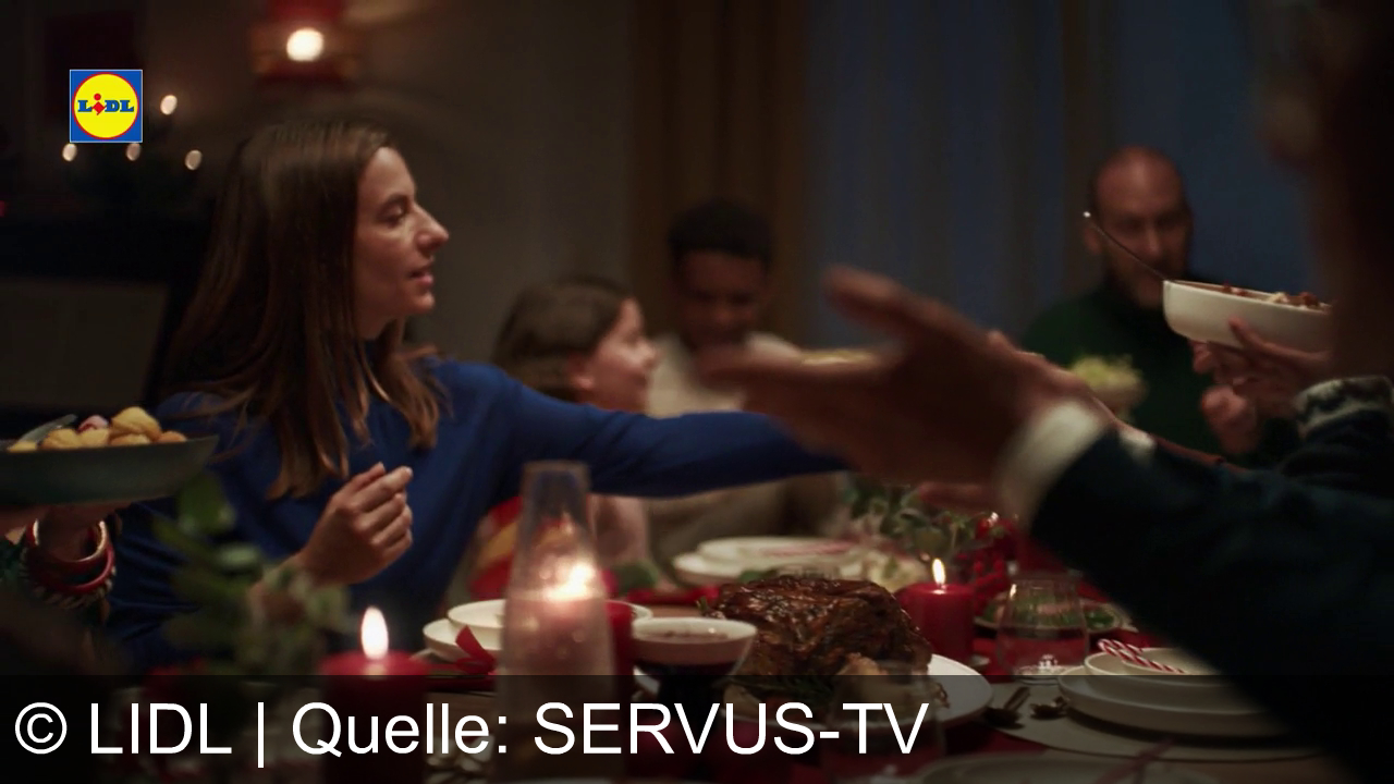 Menschen sitzen um einen festlich gedeckten Tisch. Eine Frau in Blau reicht eine Schüssel weiter. Auf dem Tisch stehen Kerzen, Geschirr und ein Braten. Im Hintergrund unterhalten sich Personen, während ein Kind zu sehen ist. Links oben ist das Lidl-Logo eingeblendet. Die Atmosphäre wirkt gemütlich und festlich.