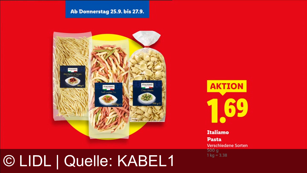 Drei Packungen Pasta vor rotem Hintergrund, oben blauer Banner: "Ab Donnerstag 25.9. bis 27.9." Rechts gelbe Schrift "AKTION 1.69", darunter "Italiamo Pasta Verschiedene Sorten 500 g 1 kg = 3.38". Links verschiedene Pastaarten in transparenten Verpackungen.