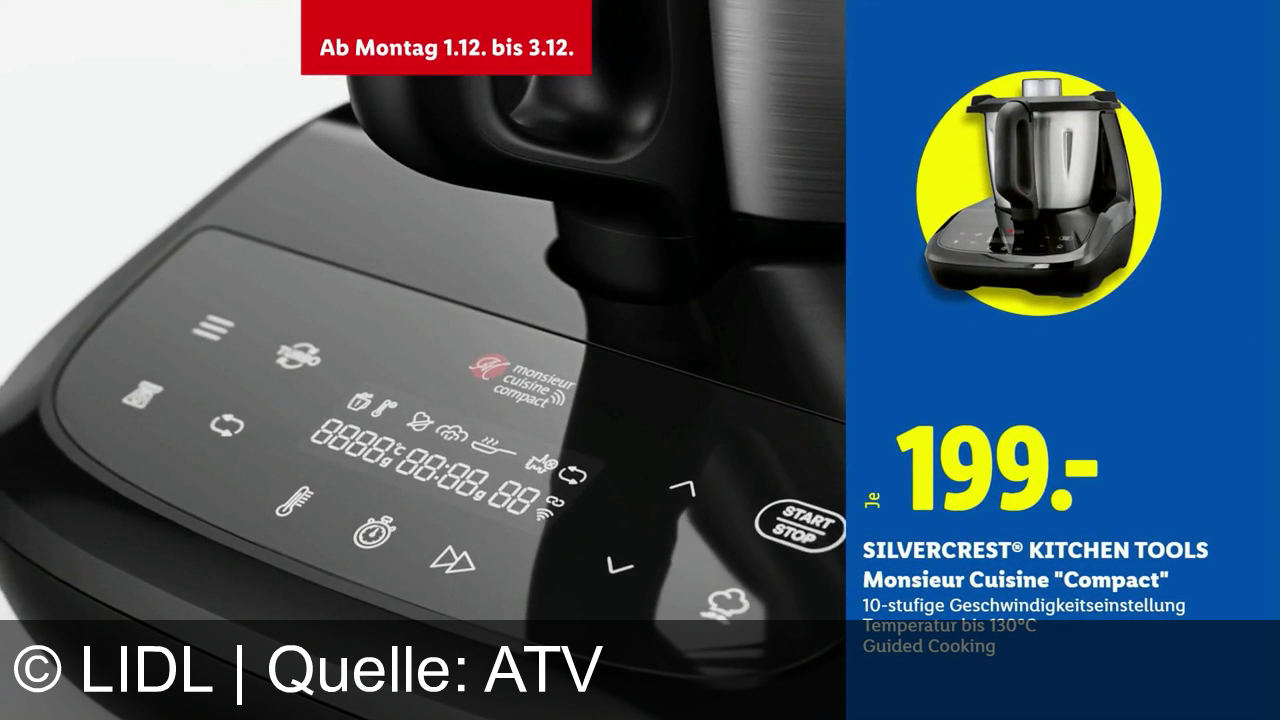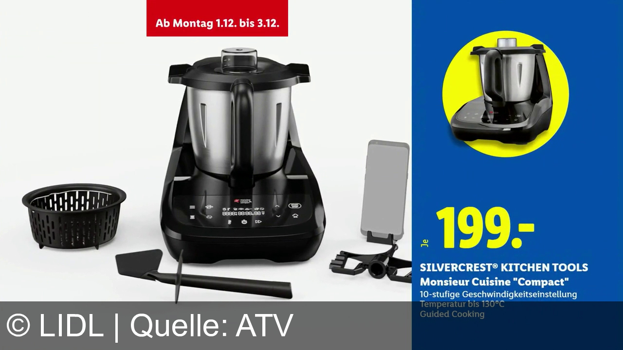 Küchenmaschine mit digitalem Display auf der linken Seite. Rechts Angebot für 199 Euro, abgebildet mit kleinem Foto der Maschine. Text: "SILVERCREST KITCHEN TOOLS", "Monsieur Cuisine 'Compact'", "10-stufige Geschwindigkeitseinstellung", "Temperatur bis 130°C", "Guided Cooking". Zeitraum: 1.12. bis 3.12. im roten Banner oben links.