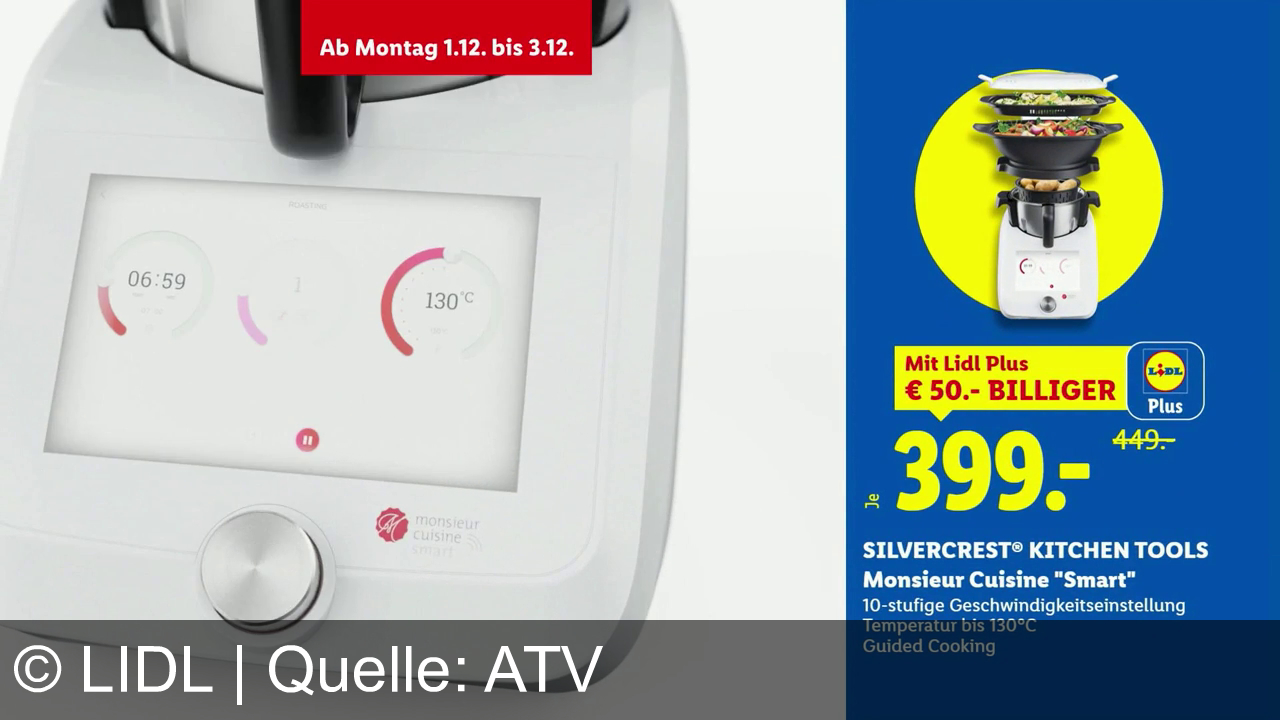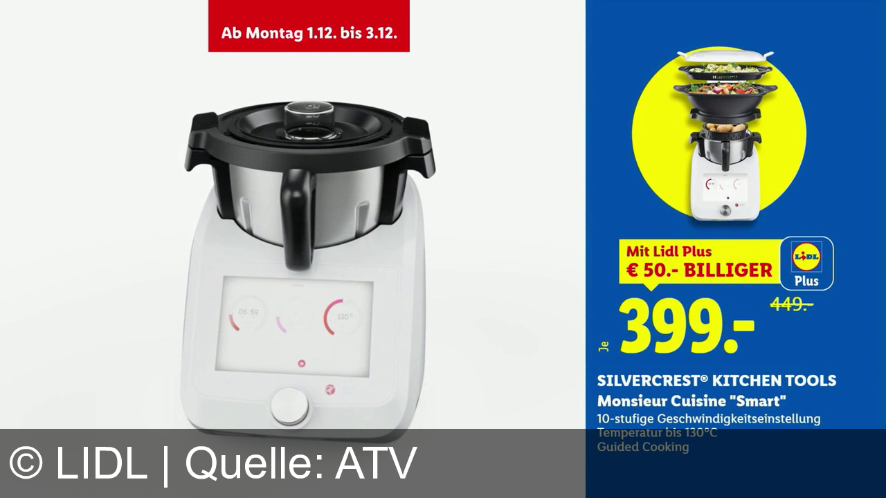 Ein weißer Küchenhelfer mit Deckel. Rechts blaue Fläche mit gelbem Kreis und dem Lidl Plus Preis von 399 Euro statt 449 Euro. Text oben: „Ab Montag 1.12. bis 3.12.“ Links Detailansicht des Geräts. Unten Beschreibung: Silvercrest Kitchen Tools Monsieur Cuisine „Smart“ mit 10-stufiger Geschwindigkeitseinstellung.