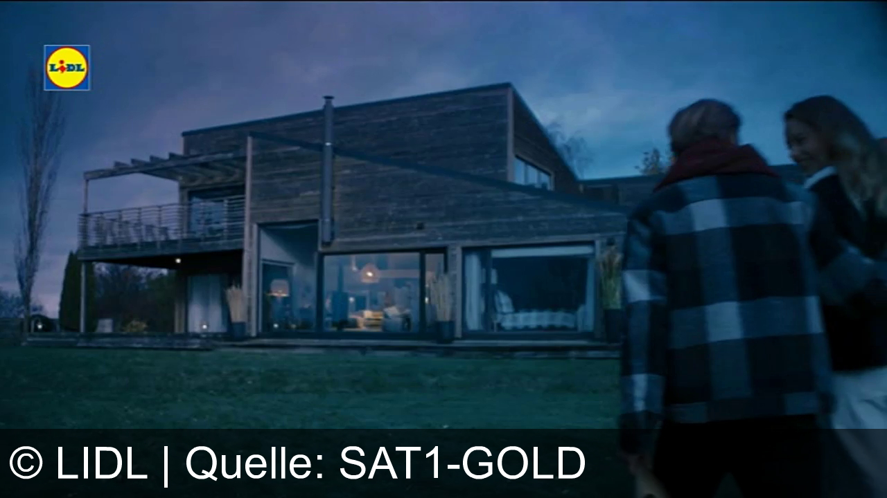 Zwei Personen stehen vor einem modernen, hölzernen Haus bei Dämmerung. Eine trägt einen karierten Mantel, die andere hat blonde Haare. Innen leuchten Lampen. Ein gut gepflegter Rasen zieht sich bis zur Hausfront. Oben links ist ein Lidl-Logo eingeblendet.
