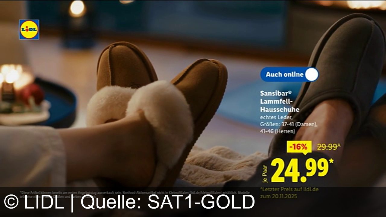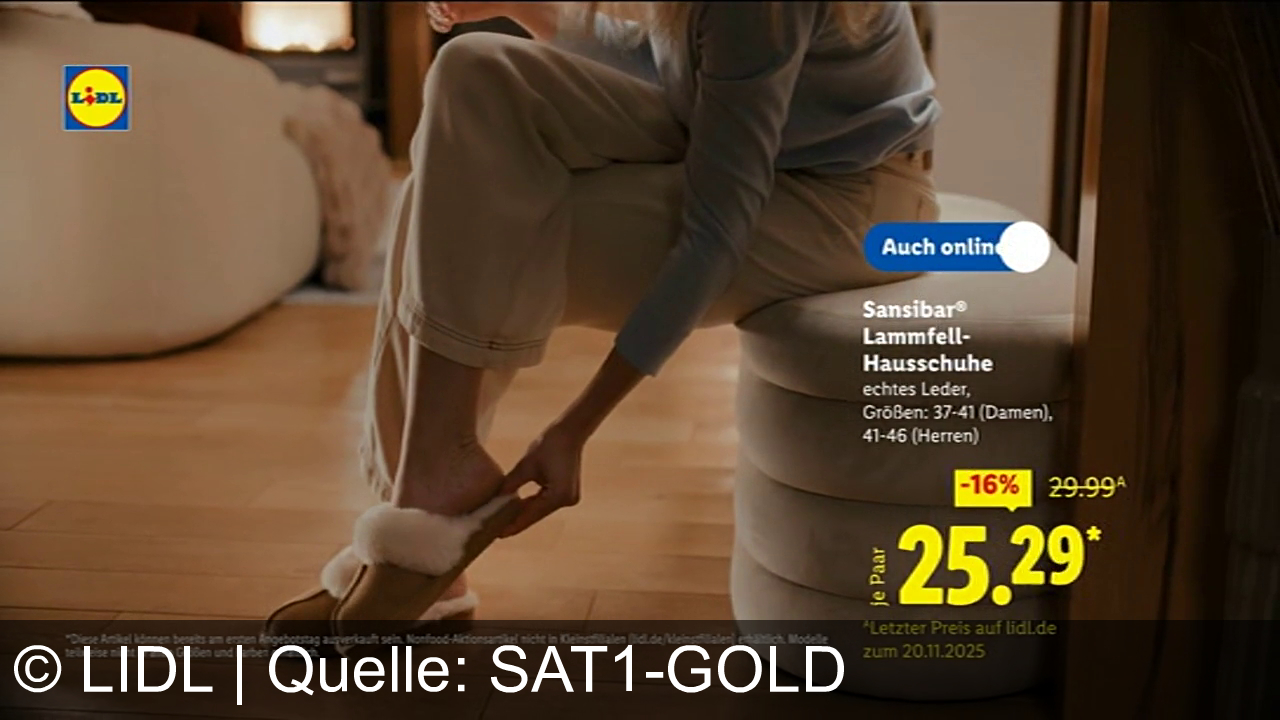 Eine Person zieht Lammfell-Hausschuhe an. Der Preis von 25,29 Euro ist um 16 % reduziert. Die Schuhe bestehen aus echtem Leder und sind in verschiedenen Größen für Damen und Herren erhältlich. Ein Lidl-Logo ist sichtbar. Es gibt einen Hinweis, dass der Artikel auch online verfügbar ist. Im Hintergrund ist ein Teppich auf Holzboden und ein Kamin zu sehen.