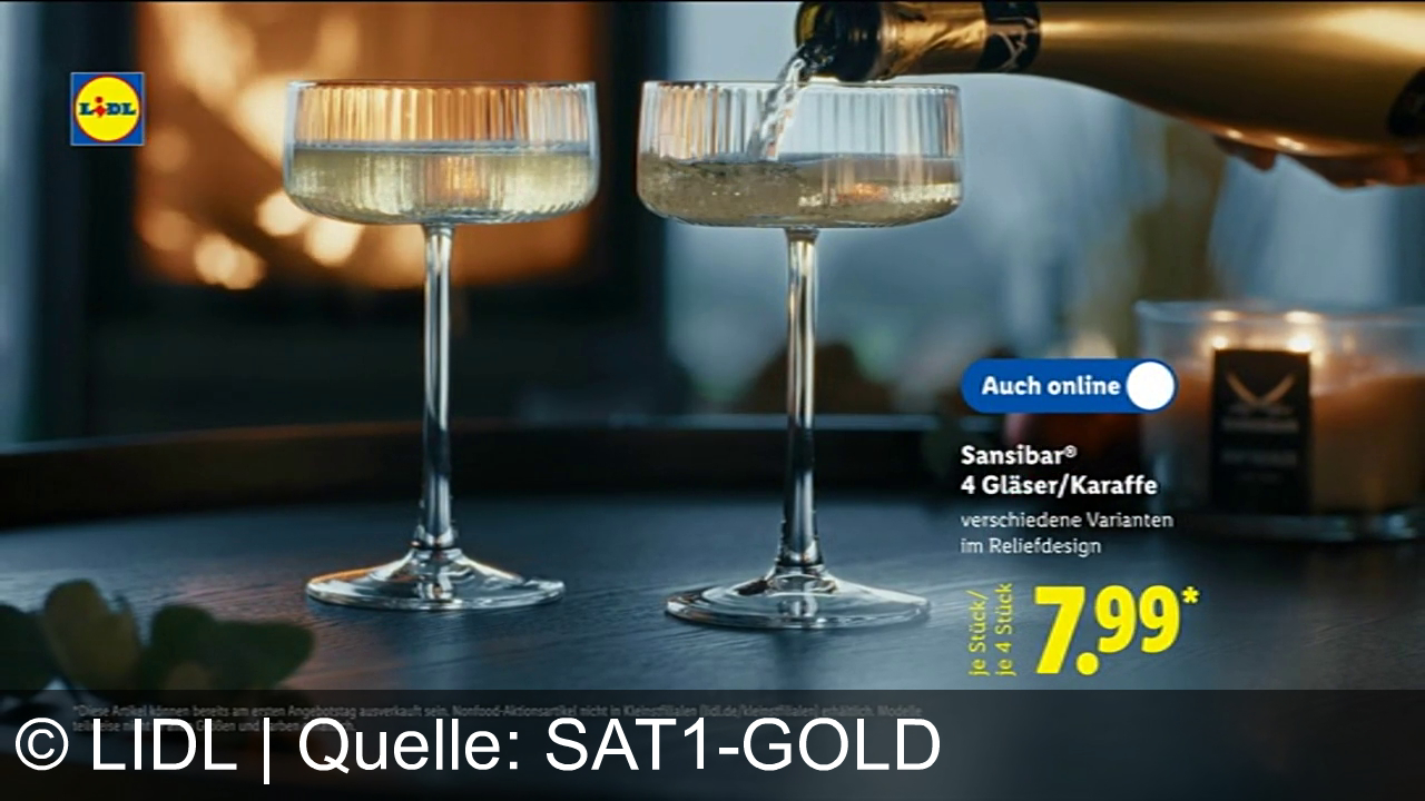 Zwei Sektgläser auf einem Tisch, in eines wird ein Getränk aus einer Flasche eingeschenkt. Im Hintergrund brennt ein Kamin. Auf der rechten Seite steht Text: "Sansibar® 4 Gläser/Karaffe, verschiedene Varianten im Reliefdesign" und ein Preis von 7,99 Euro. Oben links ist ein Lidl-Logo zu sehen. Eine Kerze und ein Dekoblatt sind ebenfalls sichtbar.