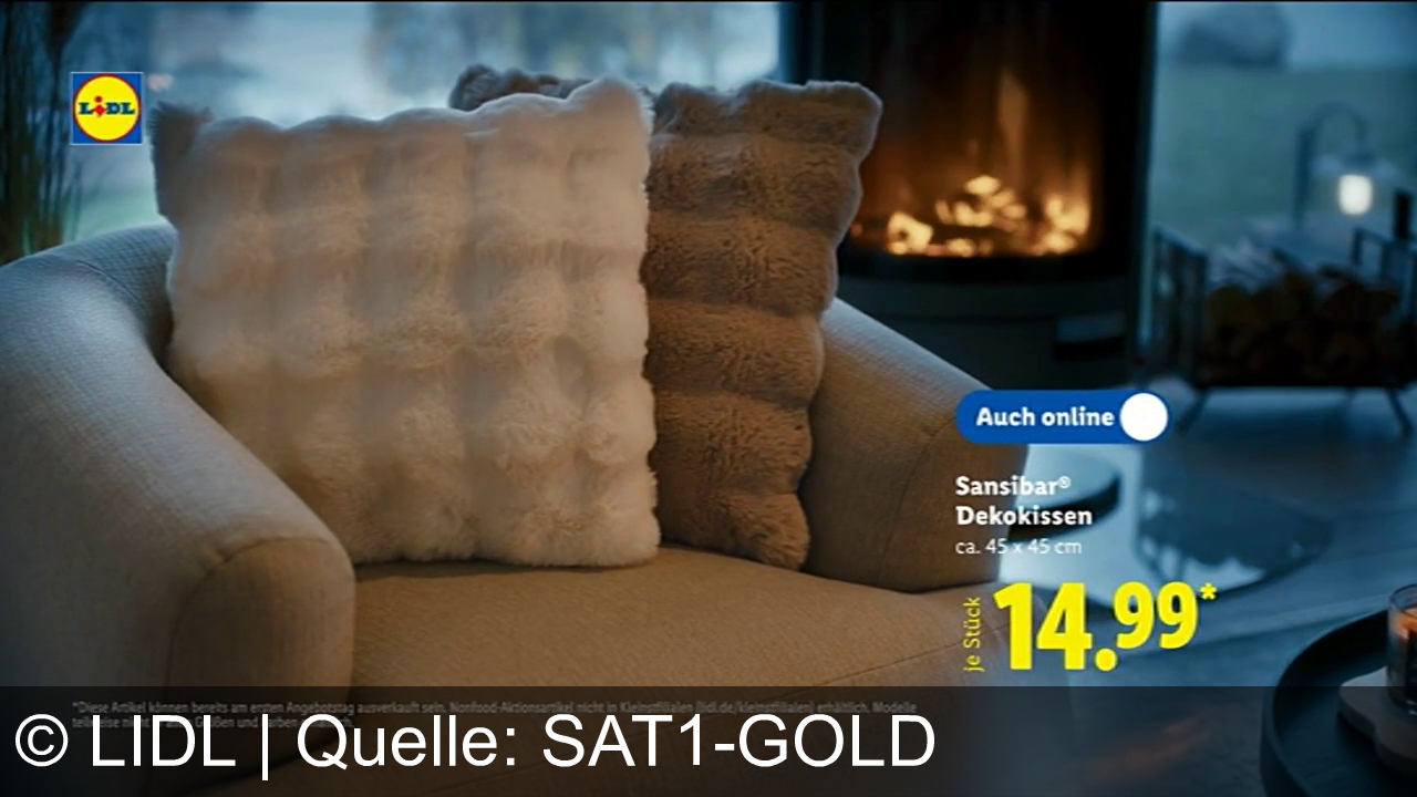 Zwei flauschige Dekokissen auf einem beigen Sessel. Im Hintergrund brennt ein Kaminfeuer. Auf einem Couchtisch steht eine Kerze. Oben links das Logo von Lidl. Rechts im Bild steht "Auch online" und der Preis 14,99 € für Sansibar Dekokissen ca. 45 x 45 cm. Unten Kleingedrucktes mit Kaufbedingungen.