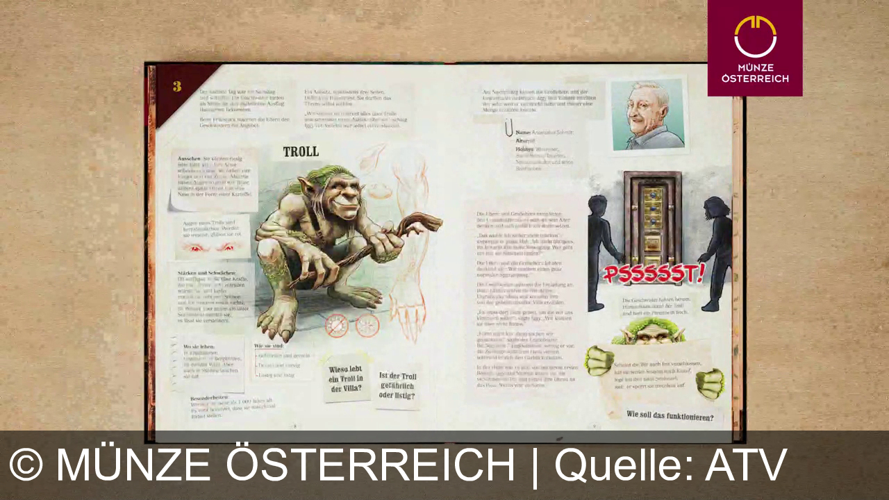 Ein illustriertes Buch zeigt einen Troll mit grünem Haar, neben Infos über Trolls. Zwei Personen stehen vor einem Safe, der Panda "PSSSSST!" taucht auf. Ein älterer Mann lächelt in einem Porträt. Oben rechts das Logo "Münze Österreich". Animiert, humorvolle und lehrreiche Elemente mit Fokus auf Mythen und Legenden.