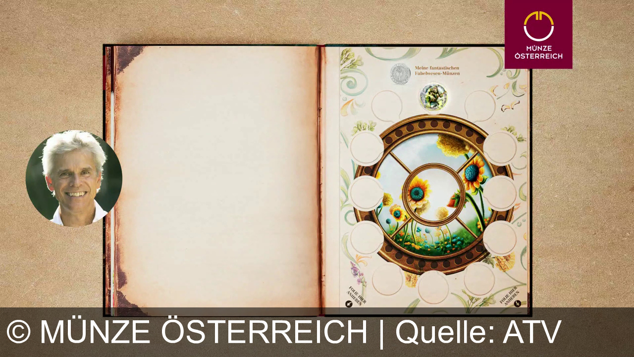 Ein aufgeschlagenes Buch, links eine leere Seite, rechts eine bunte Illustration mit Sonnenblumen und runden leeren Aussparungen. Oben steht "Meine fantastischen Fabelwesen-Münzen". Logo der Münze Österreich oben rechts. Im Kreis ein älterer Mann mit grauen Haaren, lächelnd, unten links im Bild.