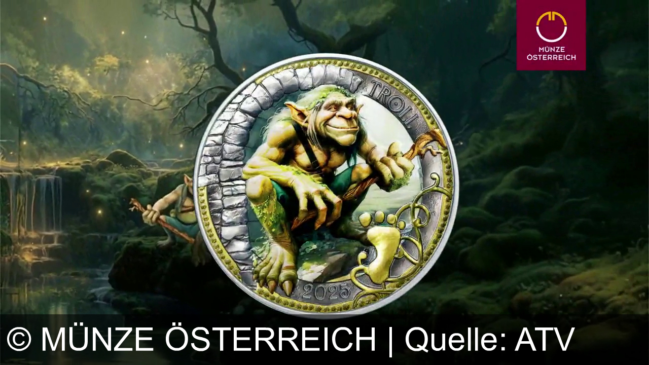 Eine Münze mit einem Troll in der Mitte. Der Troll hat spitze Ohren und hält einen Stock. Unten steht "2023". Die Szene spielt in einem Wald mit leuchtenden Punkten und Wasserfall. Oben rechts steht "Münze Österreich".