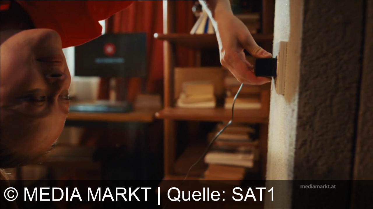 Ein Mensch hängt kopfüber, während eine Hand einen Stecker in die Steckdose steckt. Im Hintergrund stehen ein Bücherregal und ein Schreibtisch mit einem Monitor. Auf dem Bildschirm steht "mediamarkt.at".