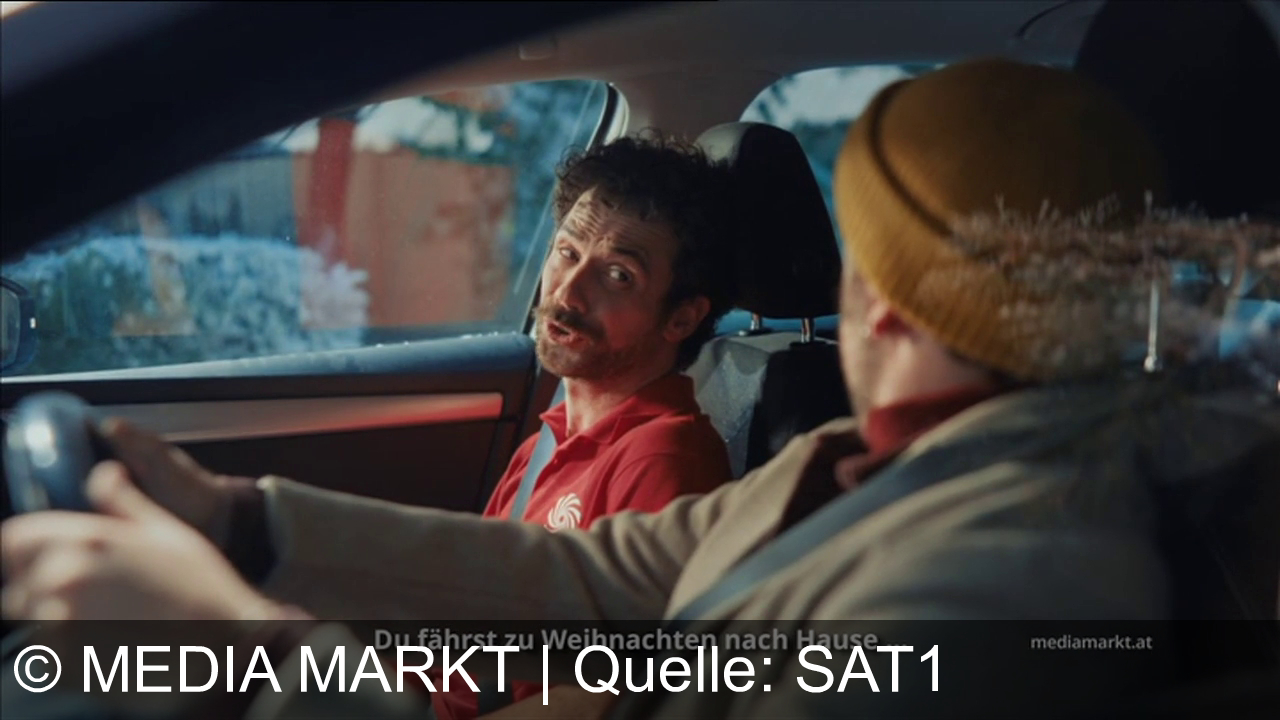 Zwei Männer sitzen in einem Auto. Der Beifahrer trägt eine rote Poloshirt und spricht mit dem Fahrer, der einen gelben Mützen und einen Schal trägt. Draußen sieht man Schnee. Am unteren Rand steht der Text: "Du fährst zu Weihnachten nach Hause..." und das Logo von mediamarkt.at.