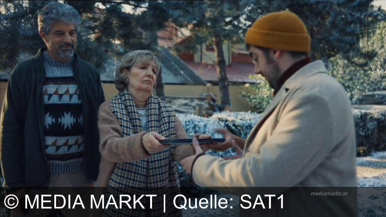 Ältere Frau überreicht jüngeren Mann ein Geschenk. Mann im Hintergrund lächelt. Frau trägt karierten Schal, Mann gelben Beanie. Verschneite Bäume und Häuser im Hintergrund. Unten rechts steht "mediamarkt.at".