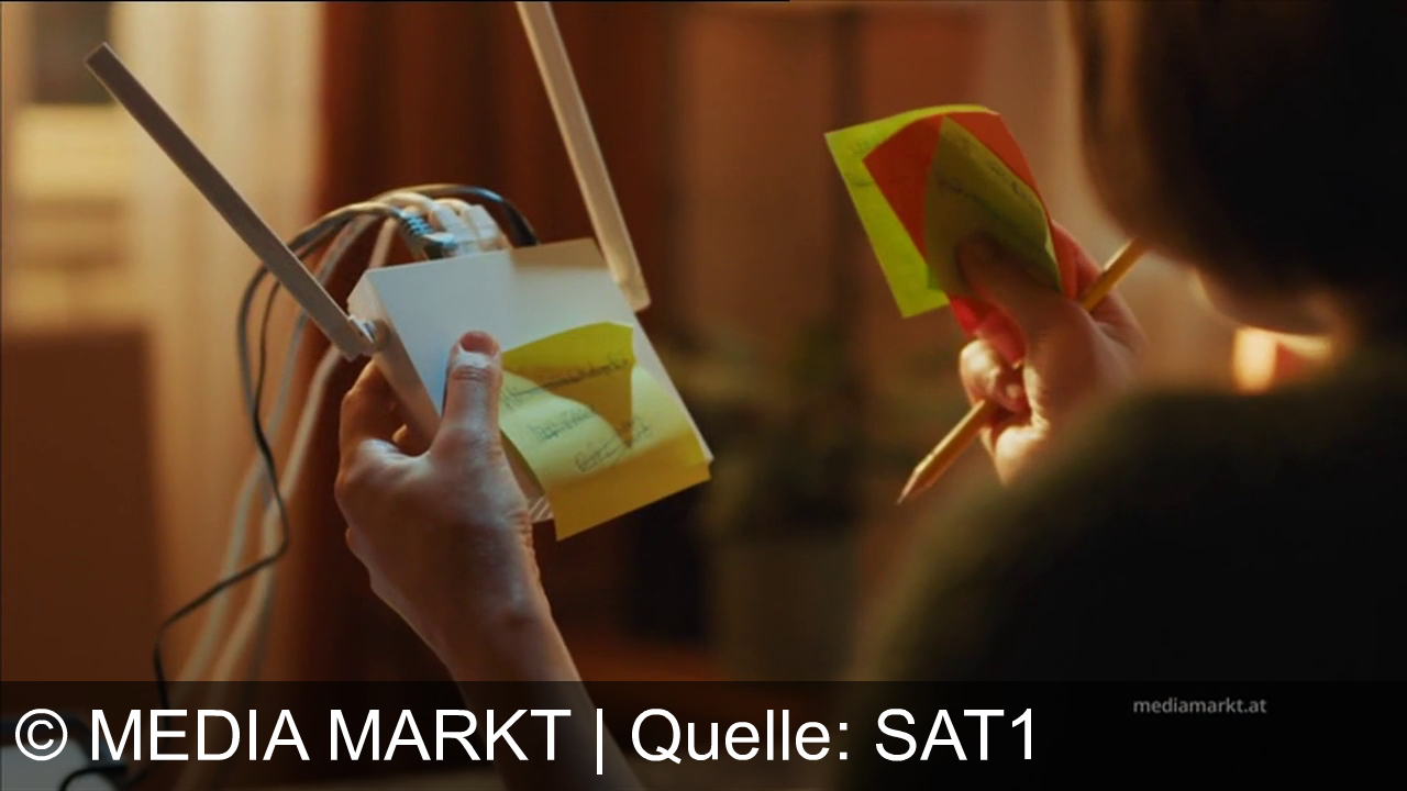 Eine Person hält einen Router in der linken Hand mit mehreren Post-its darauf. In der rechten Hand hält sie weitere bunte Post-its und einen Stift. Es gibt einige Kabel, die aus dem Router herausführen. In der unteren rechten Ecke steht „mediamarkt.at“.