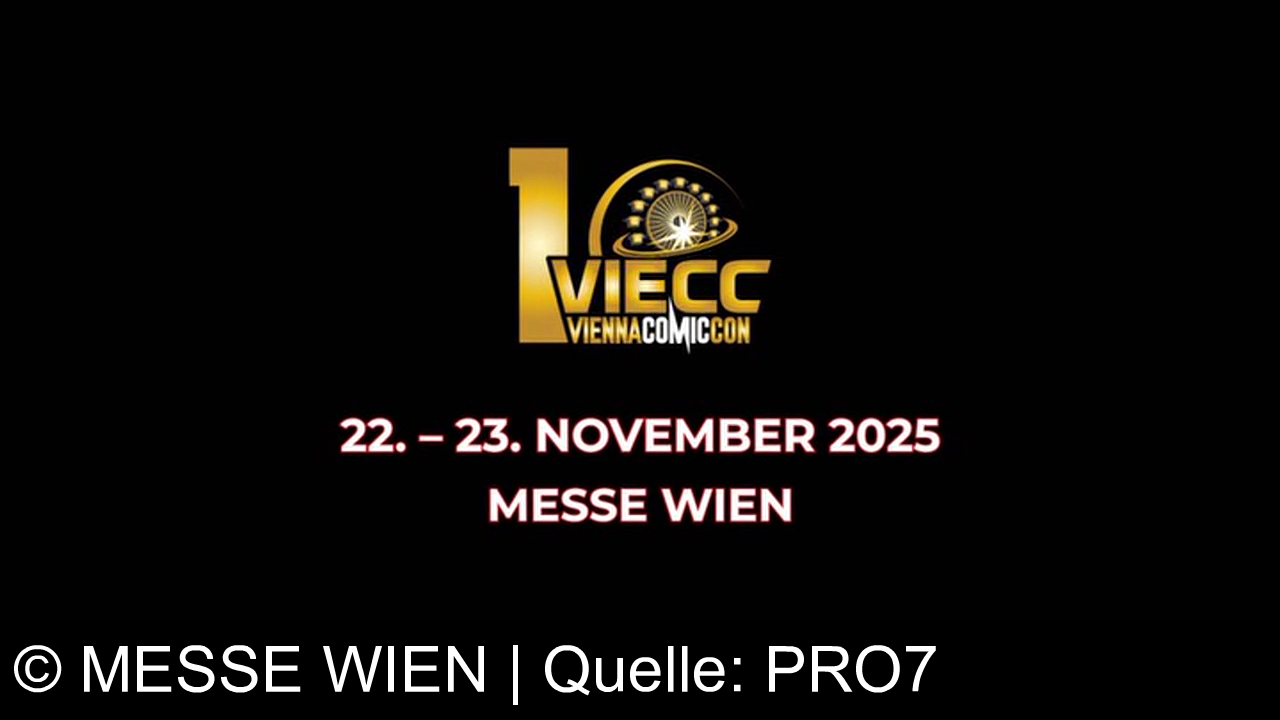 Das Logo der VIECC Vienna Comic Con, ein goldenes Emblem mit 10-jährigem Jubiläum. Darunter stehen die Daten 22. - 23. November 2025 und der Ort Messe Wien. Schwarzer Hintergrund sorgt für Kontrast.