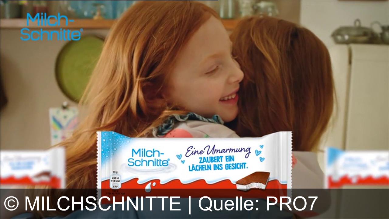 Ein Mädchen umarmt eine andere Person. Beide haben rote Haare. Im Vordergrund ist eine Verpackung von Milch-Schnitte zu sehen. Der Text auf der Verpackung lautet: "Eine Umarmung zaubert ein Lächeln ins Gesicht." Links oben steht der Schriftzug "Milch-Schnitte". Im Hintergrund sind Küchenelemente zu erkennen.