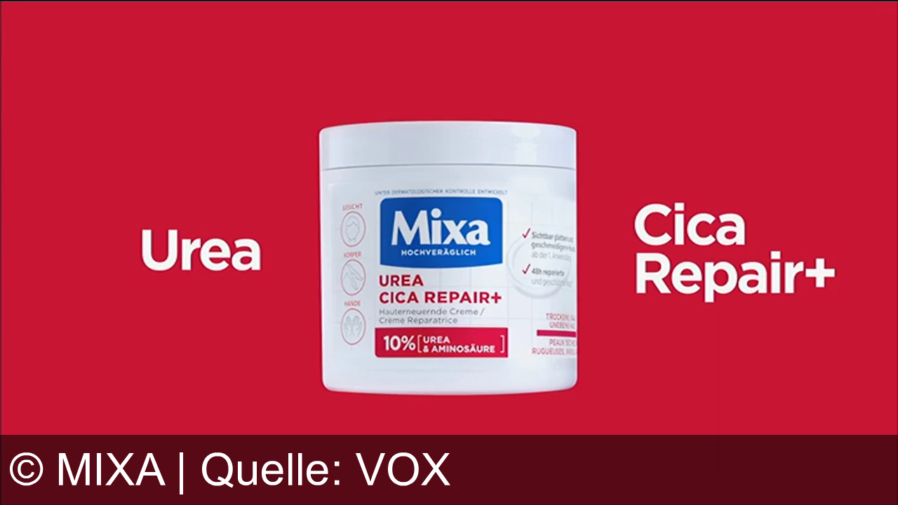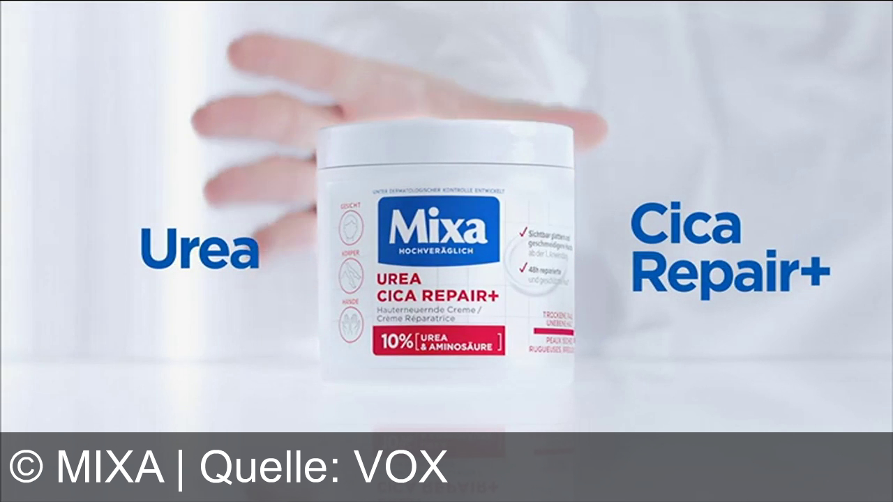 Werbung aus dem Jahr 2026 von Mixa in Österreich, mit dem von uns gewählten Titel: "Mixa Urea Cica Repair: Schnell glatte Haut und 90% weniger Schuppen – wirksame Pflege unter 8 Euro" mit der Kurzbeschreibung: "Mixa Urea Cica Repair Plus: Schnelle Hilfe bei trockener, schuppiger Haut – 90% weniger Hautschuppen nach einer Anwendung. Jetzt auch den neuen Balm Cica Plus entdecken.". Diese Werbung thematisiert oder beinhaltet die Kategorien Creme, Hautcreme, Kosmetik, Pflege.