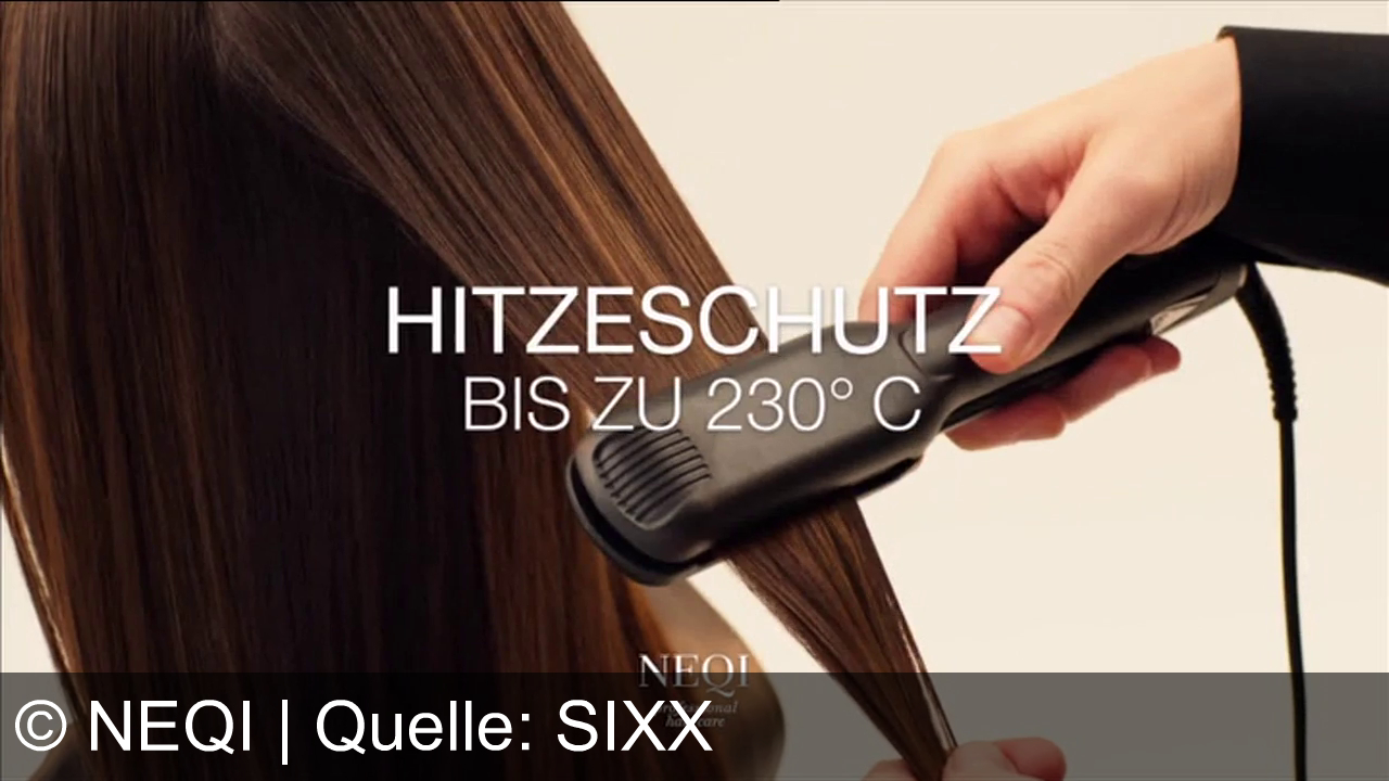 Eine Hand zieht ein Glätteisen durchs glatte braune Haar, dazu steht der Hinweis auf Hitzeschutz bis 230 Grad und der Markenname NEQI.