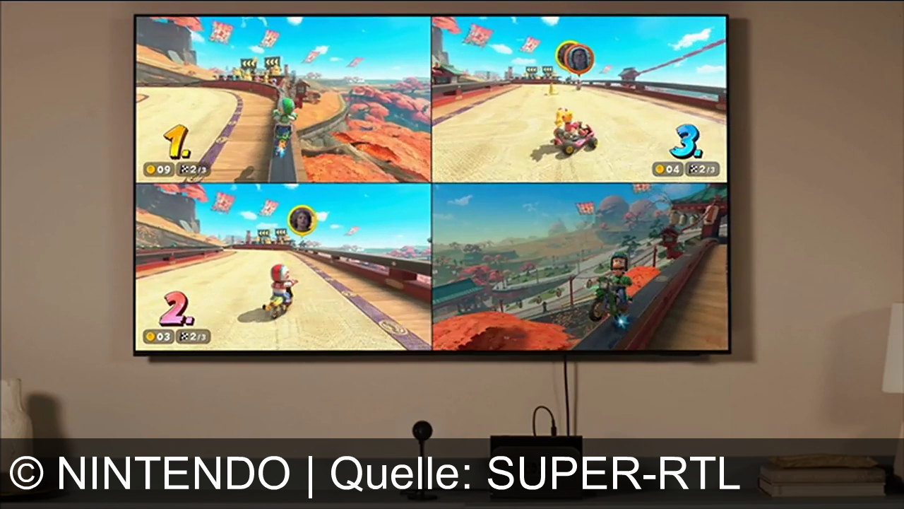 Ein Fernseher zeigt ein Videospiel mit geteiltem Bildschirm. Vier Spieler fahren in einem Kart-Rennen. Links oben ist der Fahrer auf Platz 1, links unten auf Platz 2, rechts oben auf Platz 3. Unten rechts fährt ein anderer Charakter. Eine Spielekonsole steht unter dem Fernseher, daneben Bücher und eine Lampe.
