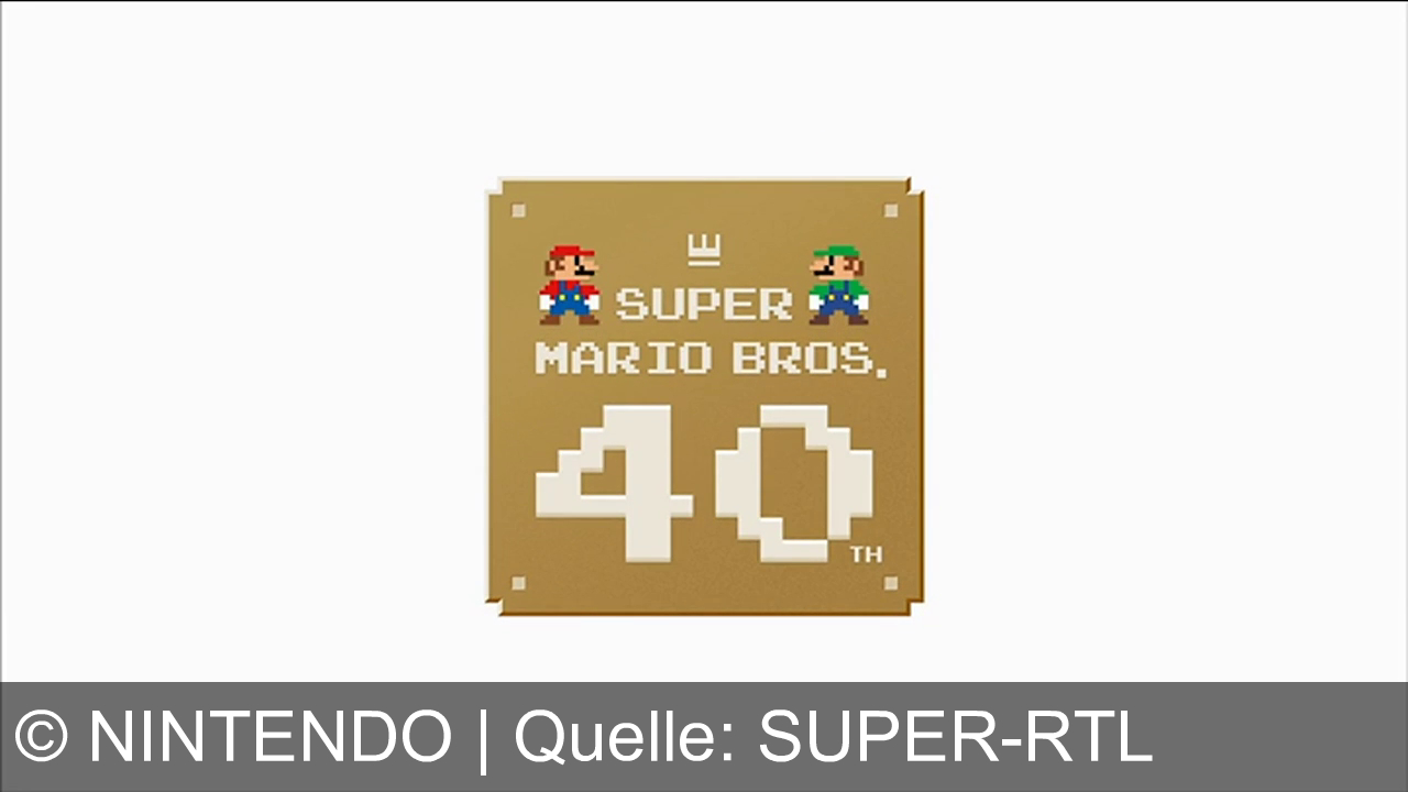Braun-goldenes Schild mit den Pixel-Charakteren Mario und Luigi oben. In der Mitte steht "Super Mario Bros." und darunter in großen Zahlen "40". Ein kleines "th" ist daneben. Alles ist auf einem weißen Hintergrund platziert.