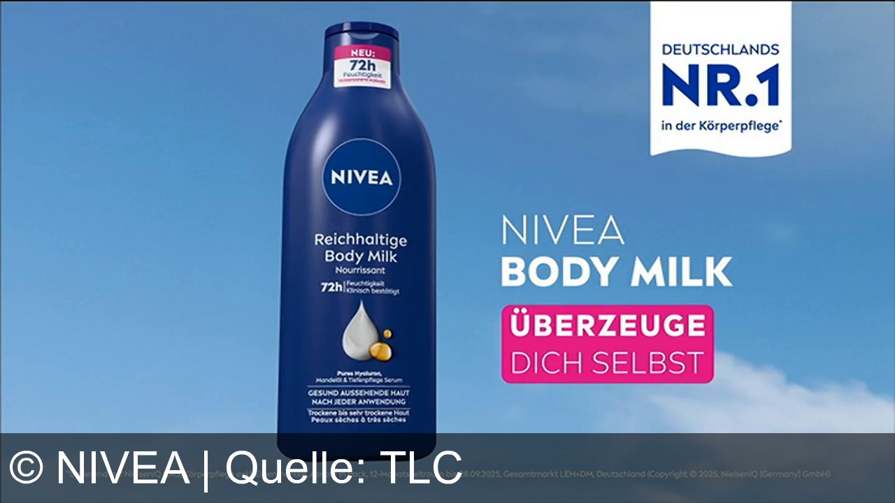 Eine dunkelblaue NIVEA Body Milk-Flasche vor klarem Himmel. Text „Reichhaltige Body Milk“ und „72h Feuchtigkeit klinisch bestätigt“. Oben links steht "NEU" und "72h Feuchtigkeit". Rechts „NIVEA BODY MILK“, „ÜBERZEUGE DICH SELBST“ in Pink. Oben rechts „DEUTSCHLANDS NR.1 in der Körperpflege“. Unten rechts kleiner Text.