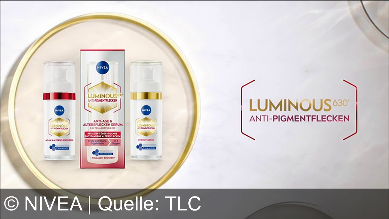 Links eine Box und eine Flasche eines Anti-Age-Serums von Nivea, Luminous630 mit gold-rotem Design. Rechts daneben steht groß der Text "Luminous630 Anti-Altersflecken". Der Hintergrund ist hellgrau.