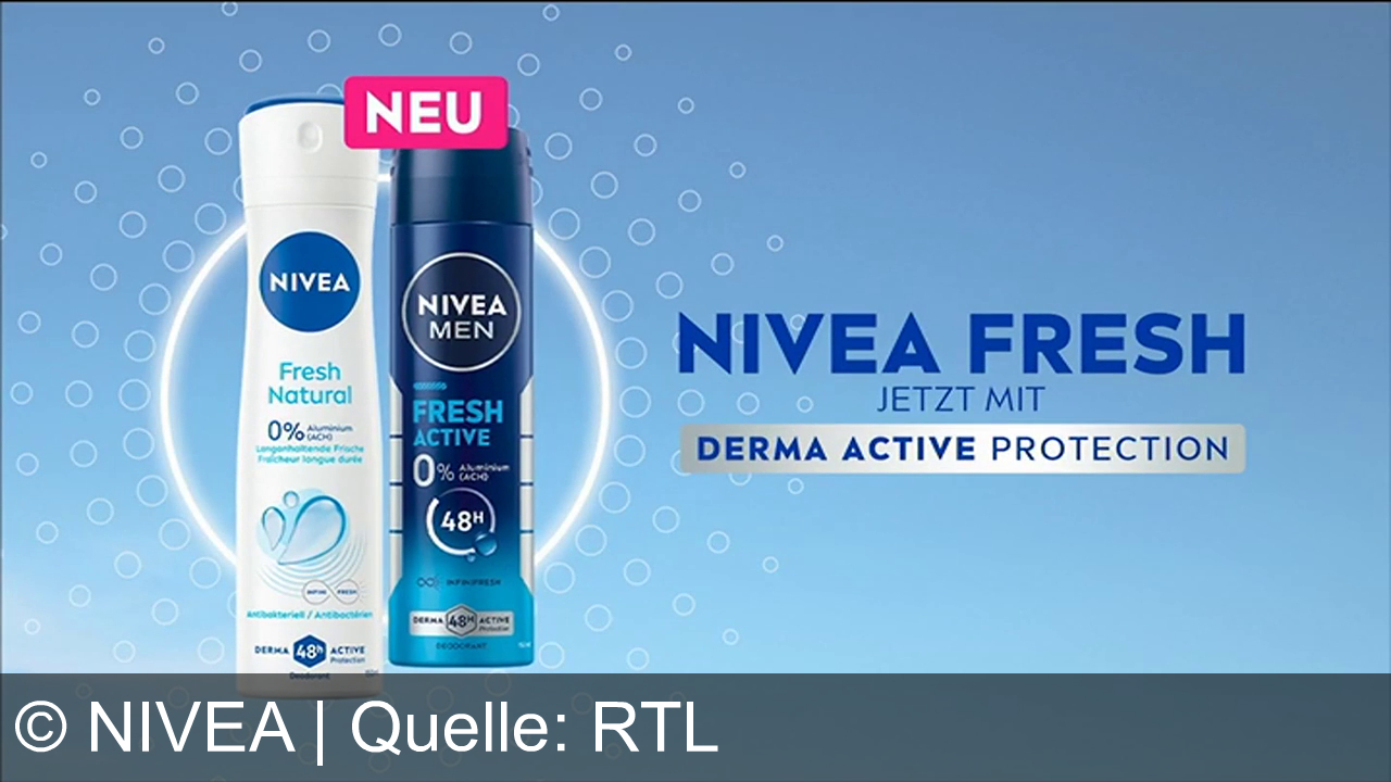 Zwei Nivea-Deo-Flaschen vor blauem Hintergrund. Links ist eine weiße Flasche mit "Fresh Natural", rechts eine blaue mit "Fresh Active". Oben links ein rotes Label mit "NEU". Rechts der Schriftzug "NIVEA FRESH", darunter "JETZT MIT DERMA ACTIVE PROTECTION". Kreise zieren den Hintergrund.