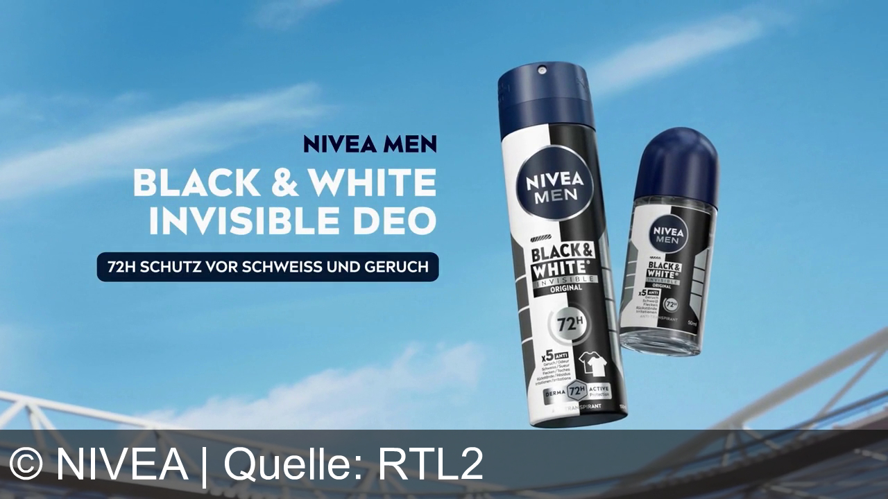 Der TV-Spot bewirbt das Nivea Men Black & White Deo als Spray und Roll-on. Die zentrale Werbeaussage betont einen 72-stündigen, starken und unsichtbaren Schutz vor Schweiß und Geruch, der weder auf der Haut noch auf der Kleidung Spuren hinterlässt. Als offizieller Partner von Real Madrid wird das Produkt in einem sportlichen Fussballkontext gezeigt.