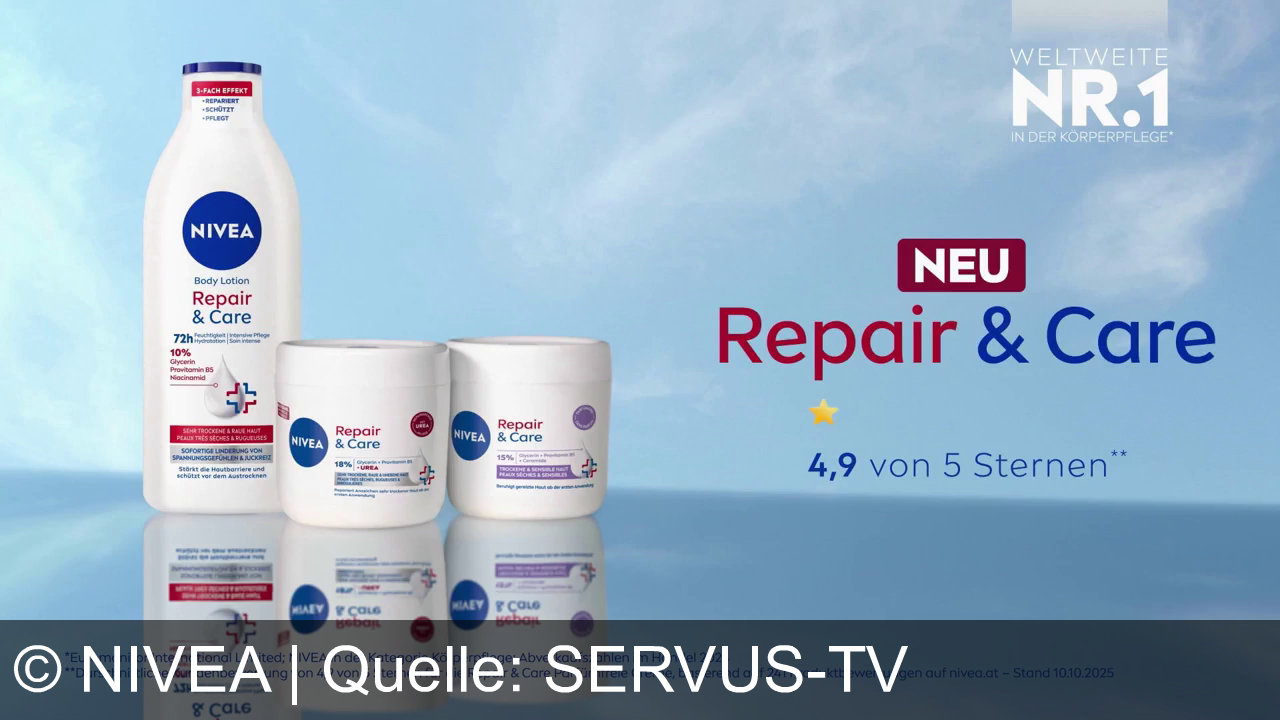 Werbung aus dem Jahr 2026 von Nivea in Österreich, mit dem von uns gewählten Titel: "NIVEA Repair & Care Body Lotion: 72h Feuchtigkeit und Reparatur für trockene, gereizte Haut" mit der Kurzbeschreibung: "Neu: NIVEA Repair & Care mit Urea – repariert trockene Haut, spendet 72 h Feuchtigkeit. Für spürbar stärkere Haut. NIVEA ist für Haut.". Diese Werbung thematisiert oder beinhaltet die Kategorien Bodylotion, Creme, Hautcreme, Pflege.