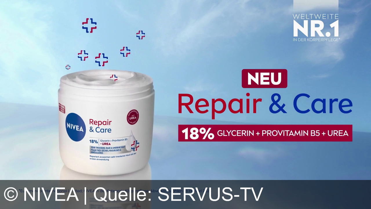 Ein Cremetopf von Nivea "Repair & Care" auf einem blauen Hintergrund. Text: "NEU", "18% Glycerin + Provitamin B5 + Urea". Im oberen rechten Eck steht "Weltweite Nr. 1 in der Körperpflege". Blaue und rote Pluszeichen um den Cremetopf. Eine kleine Schrift am unteren Rand.