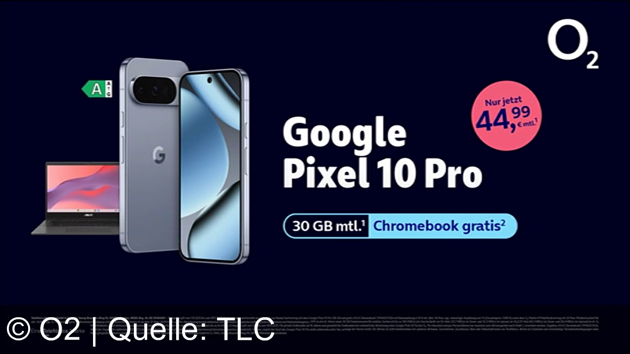 O2 bewirbt während der Black Weeks das Google Pixel 10 Pro mit 30 GB monatlichem Datenvolumen und einem kostenlosen Chromebook für 44,99 €/Monat. Die zentrale Werbeaussage: Top-Smartphone mit Tarif und Gratis-Zugabe – O2 can do.