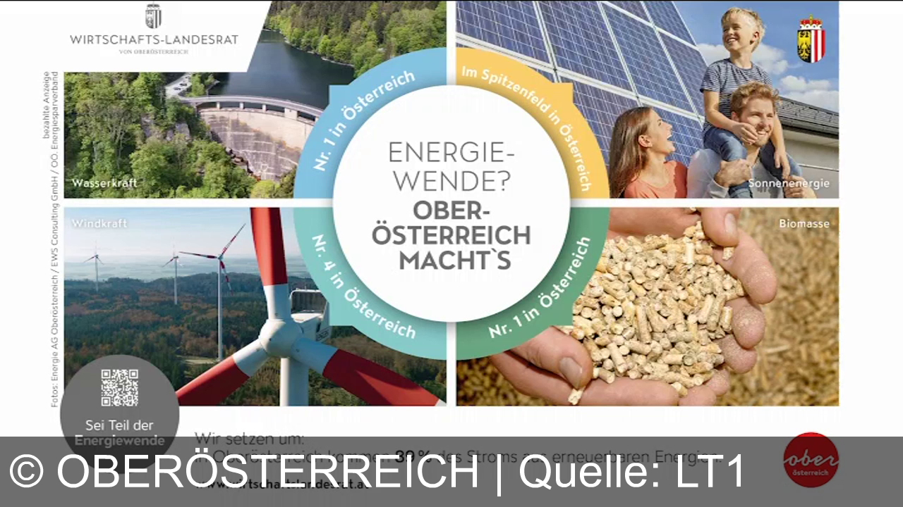 Werbung aus dem Jahr 2025 von Oberösterreich in Österreich, mit dem von uns gewählten Titel: "Oberösterreich: 89 % erneuerbarer Strom – Gemeinsam voraus bei der Energiewende" mit der Kurzbeschreibung: "Oberösterreich macht’s: 89% erneuerbare Energie, Nr. 1 bei Wasserkraft & Biomasse! Gemeinsam zur Energiewende – sei dabei! Infos unter www.wirtschaftslandesrat.at". Diese Werbung thematisiert oder beinhaltet die Kategorien Strom, Photovoltaik-Pv-Solaranlage, Wasser.