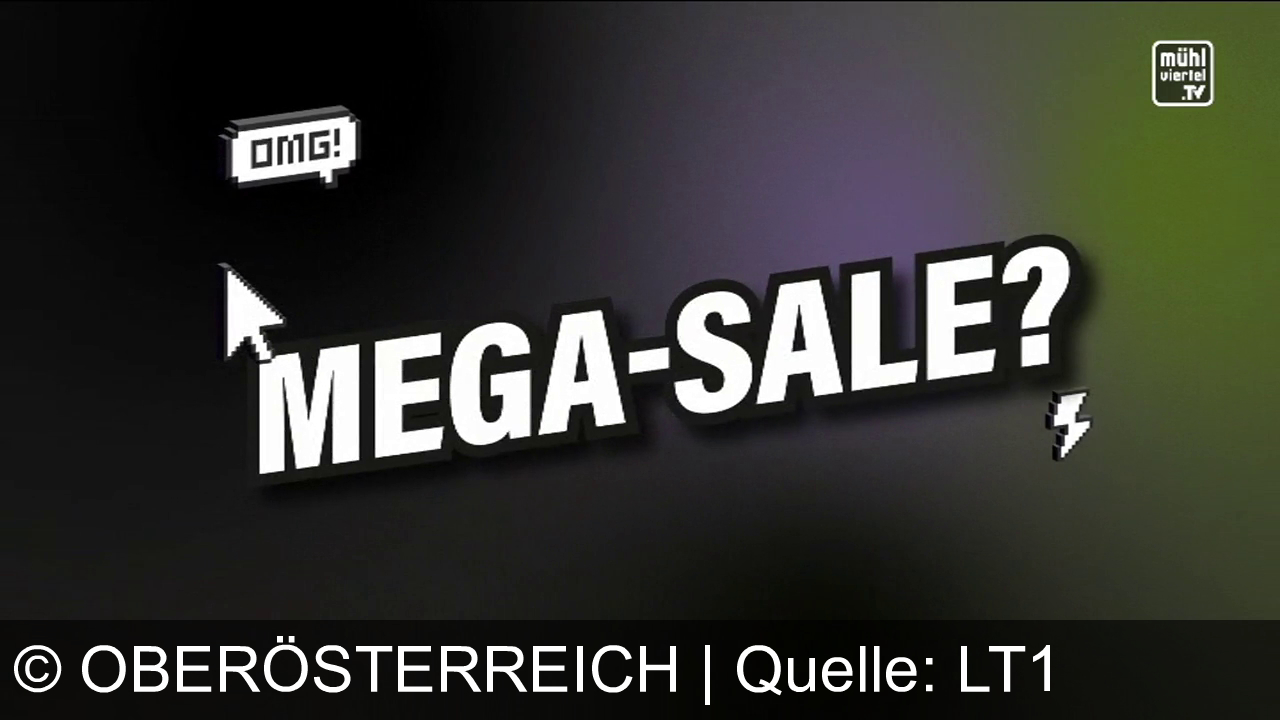Ein schwarzer Hintergrund mit großem, weißem Text "MEGA-SALE?". Ein Mauszeiger zeigt darauf. Oben links steht "OMG!" in einer Sprechblase. Oben rechts ist das Logo "mühlviertel TV". Unten rechts ein kleiner Blitz.