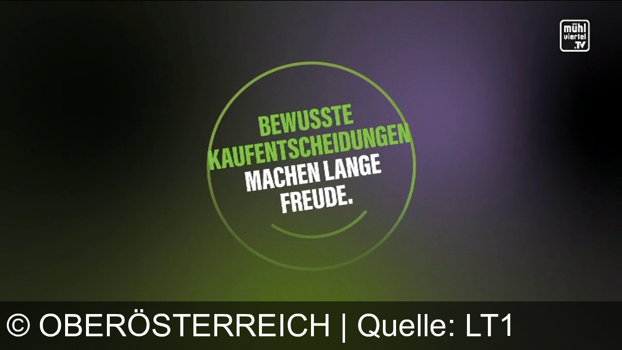 Ein grüner und weißer Text steht in einem Kreis auf schwarzem und violettem Hintergrund: „Bewusste Kaufentscheidungen machen lange Freude.“ Oben rechts steht das Logo von „mühlviertel TV“.